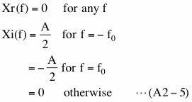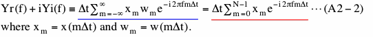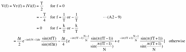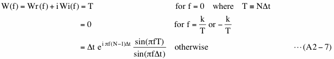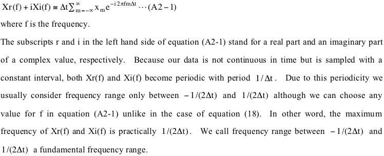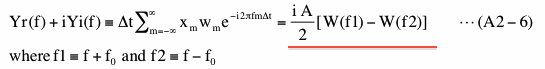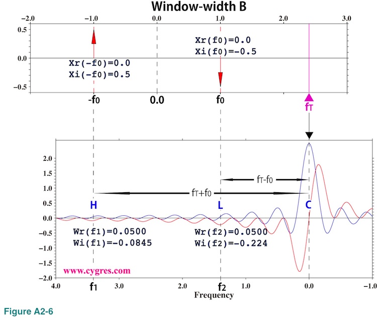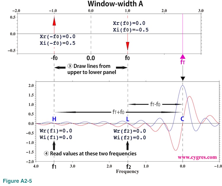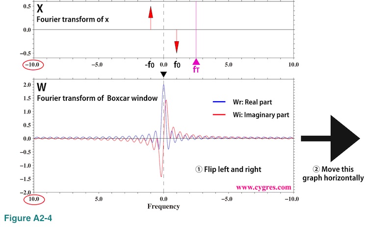The last part of equation (A2-6) (red underline) show that Fourier transform of Boxcar windowed x(t) is quite different from Fourier transform of x(t) shown by equation (A2-5). This difference is caused by spectral leakage. Decomposing W in equation (A2-6) into a real part (Wr) and an imaginary part (Wi) and substituting them into equation (A2-3), PS of the Boxcar windowed data is, To show how the spectral leakage occurs by showing the convolution process graphically we have chosen two different cases. Figure A2-3(a) shows time series plot of data (Equation (A2-4)) we have used. Each data is shown as a small dot in this graph and we connected dots by straight blue lines. The first case (Window-width A) is when window-width is 40 (data points). This is the case when frequency match is achieved and this case is equivalent to the data length A shown in Figure 2-4. From this graph we might get an impression that the second cycle is not completed in this case but the zero value point next to the end point is actually the start point of the next cycle and does not belong to the second cycle. Another case (Window-width B) is when window-width is 50 and this case is similar to the case of data length C in Figure 2-4. We intentionally made these window-widths rather narrow so that following graphs are easy to see. In the following A in equation (A2-4) (amplitude of x(t)) is 1.0 and the sampling interval is 0.05, which results that fundamental frequency range is -10 to 10. Before showing how the convolution process works we show PS for infinitely long Boxcar windowed data similar to "Our data 2" in Figure A2-1(c) and PSD for limited length data similar to "Our data" in Figure A2-2(a) first. The red line in Figure A2-3(b) shows PS of Boxcar windowed infinitely long data x(t) for the case A. Since data length is infinite, we can evaluate continuous PS. We omitted PS in the negative frequency range because PS is symmetrical with respect to the zero frequency. The vertical blue arrow in this graph is PSD of limited length data multiplied by T and divided by 2 and we call it modified PSD. It is no accident that the tip of this arrow touches PS (red line). The values of modified PSD (blue arrow) and PS (red line) at the same frequency must be the same as we described before. Since this is the case when frequency match is achieved, PSDs of bins are zero except for a signal bin as we showed in Figure 2-5(a) (Purple line; "No window" case). Thus, there is only one blue arrow in this graph and the signal frequency shown by a short green solid line matches frequency of that arrow. The vertical dashed blue lines indicate frequencies of other bins. PS at those frequencies is zero from the second line of equation (A2-7) because both f1 and f2 of equation (A2-6) become integer multiples of 1/T at those frequencies. Figure A2-3(c) shows PS and modified PSD for the case B. Since PSDs of all the bins are non-zero due to the spectral leakage, we omitted vertical dashed blue lines in this graph. The solid blue line (labeled as "Envelope") connecting tips of the arrows shows that the result shown in this graph is similar to the PSD shown in Figure 2-6(c) (Purple line). Again, values of modified PSD and PS at the same frequency are the same (tips of arrows always touch red line). Figures A2-3(b) and (c) suggest that spectral leakage always occurs but we do not see it on graphs of PSD when we achieved frequency match because the effect of spectral leakage is zero at frequencies where we ordinarily compute PSD for that case. It is slightly difficult to see but the PS of the main lobe is not symmetrical with respect to the center of the main lobe. Due to this asymmetry the bin of the maximum amplitude may not be a signal bin when we cannot achieve frequency match as we described in (2-1-3-3). Now let us show how the spectral leakage occurs by showing the convolution process graphically. We picked up bins marked by purple solid triangles labeled fT in figures A2-3(b) and (c) for this purpose. The upper panel of Figure A2-4 shows the Fourier transform of an infinitely long data x(t) and the lower panel of Figure A2-4 shows the Fourier transform of a Boxcar window function. These are graphical representations of equations (A2-5) and (A2-7), and the fundamental frequency ranges (horizontal width of the graph) of these two are the same because sampling interval of infinitely long data x(t) and Boxcar window function w(t) must be the same. There is no real part component in the upper graph of Figure A2-4. To calculate PS at frequency fT (purple solid triangle) using convolution, the first thing we do is flipping lower graph left and right. This is already done in this graph so that frequency (horizontal axis) of the lower graph decreases from left to right unlike upper graph (red circles). The next thing we do is moving this lower graph horizontally so that the horizontal position of the center of lower graph marked by a black solid triangle matches the horizontal position of fT in the upper graph. The result of this manipulation is shown in Figure A2-5. We omitted unnecessary parts in these graphs. Then, we draw lines vertically from the upper graph to the lower graph at frequencies f0 and -f0 (vertical dashed lines H and L). Since the frequency difference between H and C (rightmost vertical dashed line) is fT-(-f0)=fT+f0=f1 and the frequency difference between L and C is fT-f0=f2, frequencies of these two dashed lines in the lower graph are f1 and f2 (Please see equation (A2-6)). If f1 goes beyond of the edge shown in Figure A2-4, we use periodicity of the Fourier transform as we will show later, As a fourth step, we read values of blue (real part) and red (imaginary part) lines at places where dashed lines H and L intersect those lines. Then, we calculate X multiplied by W as In case of window-width A shown in Figure A2-5, Wr(f1), Wi(f1), Wr(f2) and Wi(f2) are all zero as we described before. Thus, PS at fT is zero from equa