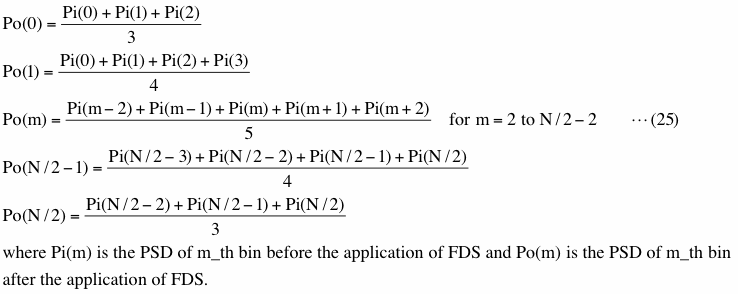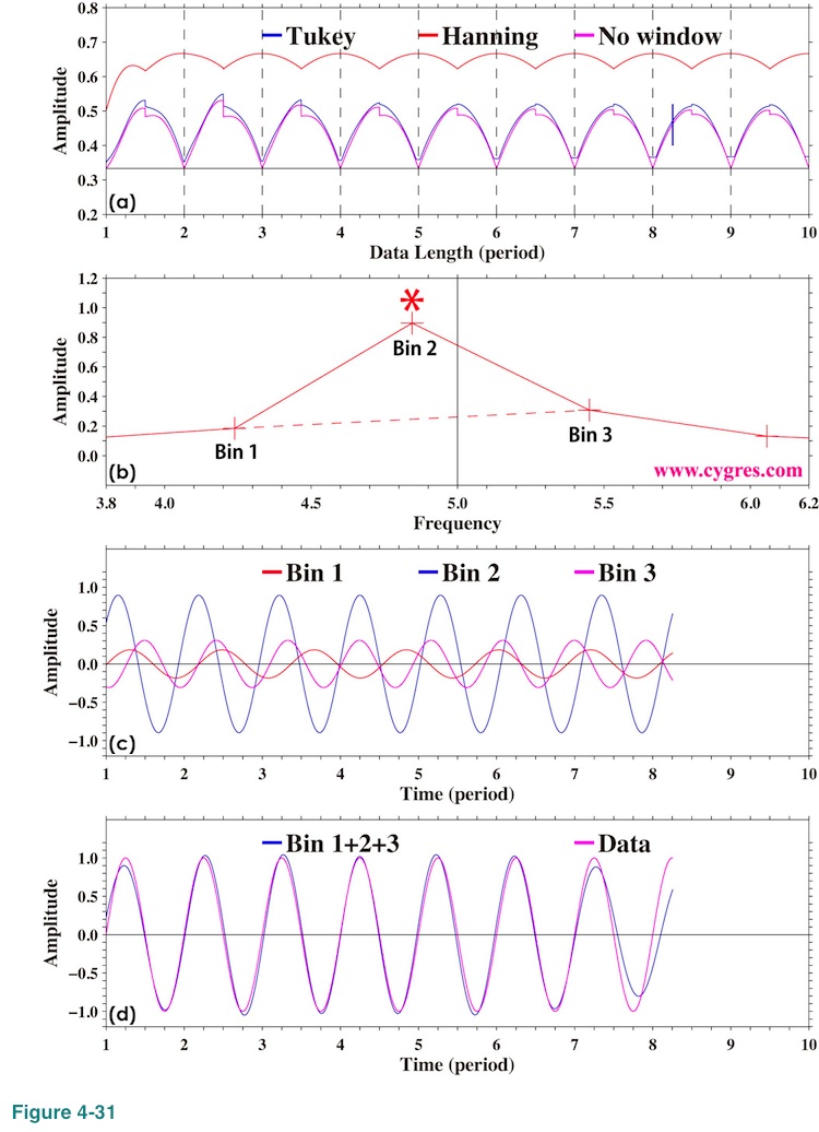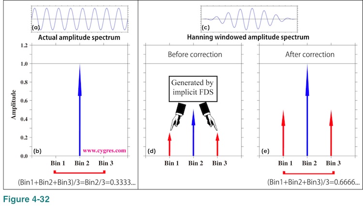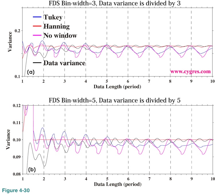 | Power Spectral Density computation (Spectral Analysis) MicroJob Package Deal Service PD001A/B(Copyright Cygnus Research International (Apr 20, 2015)) Page 7 of PD001A/B User Guide Table of Content Appendix 1; About numerical error generated by computers. (4-3) Bin-width of FDS; 1,3,5,7,... (Odd integer); Default setting is None, 3 and 7 (4-3-1) FDS works well for PSD (4-3-2) FDS does NOT work well for amplitude spectrum When frequency of the signal bin matches actual signal frequency (data length A in Figure 2-4), the amplitudes of Bin 1 and Bin 3 become zero. Figure 4-32(a) shows time series of data in this case. Amplitude of Bin 2 is equal to the actual signal amplitude (1.0) as shown in Figure 4-32(b). Thus, simple 3-bin average is 1/3 in this case. Now, let us show why Hanning windowed amplitude spectrum becomes vastly larger than non-windowed amplitude spectrum when we applied FDS. For the sake of simplicity, let us chose data length to be data length A, so that frequency of signal bin matches actual signal frequency and there is no spectral leakage. Figure 4-32(c) shows time series of data when we applied Hanning window. If we applied Hanning window, width of signal becomes wider as we described in (4-2-6) and now amplitudes of bin 1 and bin 3 are no longer zero as shown in Figure 4-32(d). The correction we described in (4-2-8) brings amplitude of bin 2 to the value almost equal to actual signal amplitude, 1.0, but it also amplifies amplitudes of Bin 1 and Bin 3 as shown in Figure 4-32(e). As a result, simple 3-bin average becomes about 2/3, which is about two times larger than the value when window is not applied. This is why Hanning windowed amplitude spectrum becomes vastly larger than non-windowed amplitude spectrum when we applied FDS. Thus, in general, FDS does not produce meaningful result for amplitude spectrum and this is why we do not write amplitude in our product file when we applied FDS. (4-3-3) Frequency resolution when we applied FDS The primarily reason why we do not discard any of Po is that it would be convenient when we want to import our product file into applications for drawing graphs and/or doing further analyses. Another reason is that we can use intermediate Po such as Po(1) and Po(2) as interpolated Po between Po(0) and Po(5). (4-3-4) Alternative method of FDS (4-4) Percentage of confidence interval; any positive value larger than 0.0 and smaller than 100.0; Default is 95.0 Appendix 1; About numerical error generated by computers. What we would like to say here is that it is reasonable to think that the values of purple and red lines outside of the signal peak in Figure 2-5(a) are zero although actual numbers are not zero. Appendix 2; Spectral leakage of power spectrum density function and window functions. In (4-2-1) we described that the 'cliff' at boundaries generated by the assumption of repetition of data (Figure 4-14(b)) is a cause of spectral leakage. The assumption we described there is consistent with the method we and many other people use to compute PSD and the explanation of the cause of spectral leakage is reasonable. However, it only gives us an idea how spectral leakage is generated but we cannot evaluate how large generated spectral leakage would be. Also we will have a problem explaining why we still have spectral leakage even after we applied a window function to remove 'cliffs'. In this appendix we first introduce alternative way of looking at our limited length data. After that we show how spectral leakage is generated and how large they would be. Finally we describe how to reduce spectral leakage. The root cause of spectral leakage is the fact that the length of our data is limited. (1) Alternative way of looking at our limited length data We do not assume repetition of data described in (4-2-1). Then we apply a window function w(n) shown in Figure A2-1(b) to this infinitely long data. This window function is called a Boxcar window function due to its shape. The result is "Our data 2" shown in Figure A2-1(c). At this point all we need to know about "Original data" is the values between t=0 and T and we know them because our data covers that duration. We can construct "Our data 2" in Figure A2-1(c) in a different way. We start from our limited length data x'(n) shown in Figure A2-2(a). This is the exact copy of the one we showed in Figure 4-14(a). Then, we add infinitely long "Additional data" z(n) shown in Figure A2-2(b) to "Our data" x'(n). All the values of z(n) are zero. Since Fourier transform of z(n) is also zero for any frequency, adding z(n) to "Our data" x'(n) would not modify spectral characteristic of x'(n) at all. By adding z(n) to x'(n), we will get "Our data 2" y(n) shown in Figure A2-2(c). This "Our data 2" is exactly the same as the one shown in Figure A2-1(c). As we described before, we can add any number of data, value of which is exactly zero, to data we want to analyze in order to adjust data length so that we can achieve frequency match. We called it "zero padding". What we did here is the extreme form of zero padding. The reason why we introduced these two methods to generate identical infinitely long data, "Our data 2", is that we will describe spectral leakage as a deviation of spectral of "Our data 2" shown in Figure A2-1(c) (and Figure A2-2(c)) from spectral of infinitely long data shown in Figure A2-1(a). The latter of which is consdered to be a "true" spectral. This approach makes sense because, although "Our data", limited length data shown in Figure A2-2(a), is what we usually have, spectral characteristic of it is the same as the spectral characteristic of "Our data 2". In other word, we consider limited length "Our data" as a result of the application of a Boxcar window function to an infinitely long data in this appendix. This leads us that if we study how changing the width of a Boxcar window function would affect spectral of resultant windowed data (Figure A2-1), then we would know how changing the d