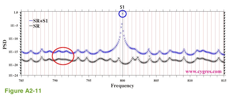 Figure A2-10(a) shows that spectral leakage of S1 practically makes it impossible to detect SR if we did not apply any window. Figure A2-10(b) shows that spectral leakage of S1 is reduced considerably by Hanning window but existence of it is still obvious. MEM, by principle, produces no spectral leakage by windowing and, Figure A2-10(c) clearly shows it. Now, let us take a look at S1 instead of SR. The PSDs of S1 shown in Figure A2-10(a) and A2-10(b) are reasonably close to the actual PSD of S1. On the other hand, PSD of S1 shown in Figure A2-10(c) is considerably smaller (about 1/500000000) than the actual PSD of S1 although PSDs of S2, S3 and others of SR are comparable to those in Figure A2-10(b). This is mostly because we did not compute PSD at the frequency of S1 (800) although S1 is a constant amplitude and constant frequency pure sinusoid without any phase variations. To make this point clearer we recomputed PSD with a much smaller frequency interval. The blue (SR+S1) and the black (SR alone) "x" marks in Figure A2-11 show the results of these recomputations. Please note that the frequency range of this graph is only between 785 and 815. The vertical red lines in this graph indicate frequencies where we computed PSD in Figure A2-9(c) and the vertical black line at the center of this graph indicates frequency of S1. One of the frequencies where we computed PSD this time exactly matches the frequency of S1 and the blue "x" mark at the center of the blue circle labeled S1 shows PSD at the frequency of S1. This value is reasonably close to PSD of S1. Ideally, we should not be able to see S1 except at the exact frequency of S1 but we can see S1 in Figure A2-10(c) because MEM gives non-zero frequency width to S1 (S1 is not a "line" but a steep "mountain") as shown in Figure A2-11. Nevertheless, this graph suggests that we need to choose frequencies where we compute PSD carefully if it is important to know magnitudes of PSD of signals when signals are similar to S1, a constant amplitude and constant frequency pure sinusoid without any phase variations. If the magnitude of S1 is comparable to those of S2 and S3, we might even miss S1. However, if amplitude of S1 varies, theoretical peak of PSD due to S1 will have some frequency width as we described in (Case 3) of (2-1-3-3). The horizontal scale of "hills" and "valleys" shown by "x" marks in Figure A2-11 is about the same as horizontal distance between adjacent vertical red lines. Thus, the frequency interval of PSD computations we chose for Figure A2-11 is apparently much smaller than the actual frequency resolution of PSD. Frequency resolution of PSD computed by MEM is determined by AR order and there is a limit determined by sampling interval and number of data. Computing PSD with smaller frequency interval as we did may help obtaining peak frequencies accurately but it does not necessarily give us PSD of a finer frequency resolution. Another thing we would like to mention is that, while MEM does not leak spectrum, we still can see the effect of S1 (red ellipse) away from the "mountain" of S1. Since MEM does not assume that data is composed of pure sinusoids unlike PD001A/B (please, see equation (3)) MEM occasionally gives us unexpected results when data is consist of pure sinusoids as in the case shown in (2-1-3-3). We generally recommend computing PSDs by several different methods and comparing results for serious spectral analyses. Appendix 3; Why we see a single peak instead of twin-peaks when data length is short. When data is short relative to the period of S1, f1 will be included within zero-frequency bin because frequency bandwidth of bins (frequency resolution) is so large. Then, convolution would not modify frequency of S0 and the peak of PSD of our data will be at f0. At this stage, data is practically S0 except that amplitude is very, very slowly varying. Please note that this data length is short relative to the period of S1 but it is fairly long relative to the periods of SL and SH as shown in Figure 2-11. As we increase data length, frequency resolution of the Fourier transform becomes finer and f1 leaves from zero-frequency bin but moves toward higher frequency bin. Then, convolution of the Fourier transform of S1 and the Fourier transform of S0 starts generating twin-peaks center of which is at f0. The alternative way of understanding why we need more than certain length of data to have twin-peaks is considering this as a problem to separate two neighboring singnals, frequency difference between them is 2 x f1. Appendix 4; How the frequency of S1 affects the detectability of SR END of User Guide of PD001A (Copyright: Cygnus Research International, Apr. 21, 2014) |