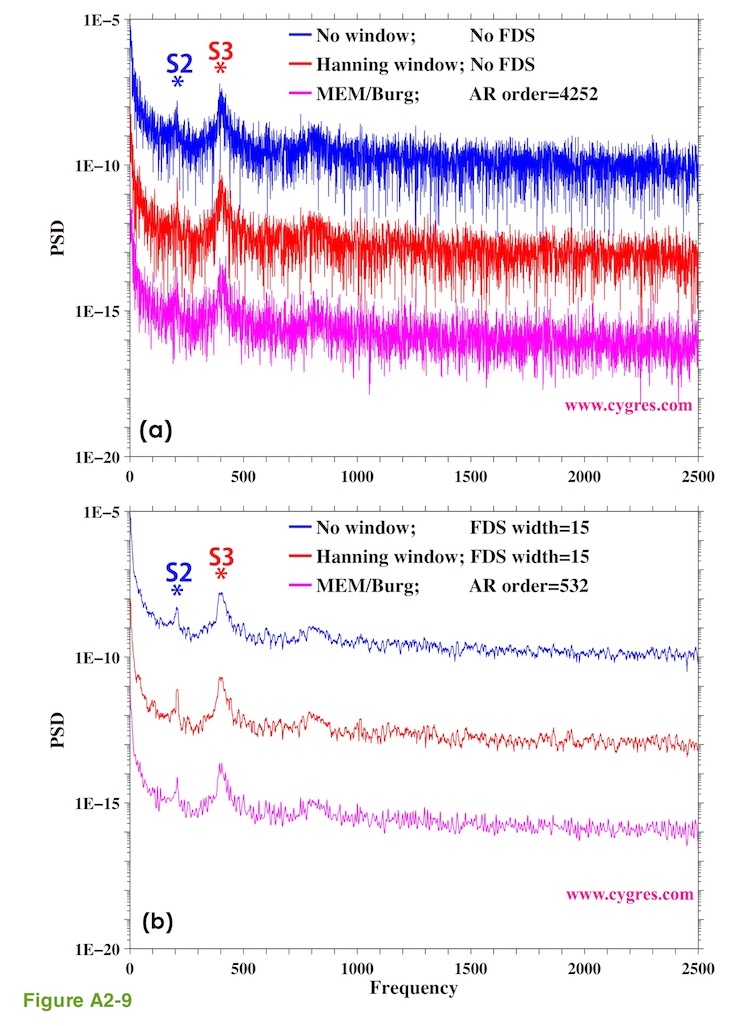 Figure A2-7 shows convolution process for general cases when the Fourier transform of infinitely long data (X in Figure A2-7(a)) is more complicated than the one we have shown so far. In this graph we show segment A covering fundamental frequency range and segment B, frequency width (horizontal width in this graph) of which is the same as frequency width of segment A. The contents of these two segments are identical due to the periodicity of X we described before. Let us assume we want to compute PS at frequency fT (purple triangle) as before. We shift horizontal position of the graph of the Fourier transform of a Boxcar window function (W in Figure A2-7(b)) after flipping it left and right as before. Here, the frequency width of W is the same as the frequency width of segment A. For the convolution we chose segment E of X. The frequency width of segment E is the same as frequency width of segment A. The segment E lacks the segment C of segment A at left but the segment D of segment B added at right compensates this missing segment. Again, due to the periodicity of Fourier transform, contents of segments C and D are identical. In this way, the extent of convolution covers entire fundamental frequency range of X no matter where fT exists. We multiply segment E of X by W in the same way we did in figures A2-5 and A2-6; multiply two values at the same horizontal position together. The result of this multiplication is shown in Figure A2-7(c). Then we integrate (sum) this result to obtain Yr(fT) and Yi(fT) to compute PS at frequency fT using equation (A2-3). These graphs clearly show that the convolution is similar to the weighted moving average (in the strict sense it is not an average because the integral of weight is not equal to 1.0) of X with the weight W and the width of averaging is equal to the fundamental frequency range. As a result, PS at any frequency fT would pick up all the signals on X except for those at frequencies f that satisfy fT - f = +/- k/T (second line of equation (A2-7)). (3) How to reduce spectral leakage As an example of an alternative window function we use a Hanning window function here. The Fourier transform (discrete) of a Hanning window function is Figures A2-8(a) and (b) show Fourier transform of a Boxcar window function and a Hanning window function, respectively. While we can see blue and red lines clearly over entire frequency range in Figure A2-8(a), it is difficult to see those lines beyond of +/- 2.0 in Figure A2-8(b). Figure A2-8(c) shows PS of these two windows. Please note that we used logarithmic scaling for this graph unlike others. From this graph we can see that Hanning window would considerably reduce spectral leakage and reduction rate would progressively increase as the difference between fT and f0 (Figure A2-4) becomes larger. This graph also shows that, although applying Hanning window removes 'cliff' described in (4-2-1), we will still have spectral leakage. Another thing we can see in this graph is that while the PS of a Boxcar window function at frequencies marked by blue asterisks is zero, PS of a Hanning window function is not zero at those frequencies. Also, PS of a Hanning window function at zero frequency (black dashed vertical line) is smaller than the PS of a Boxcar window function at that frequency. These are the cause of widening of signals when we applied a Hanning window function as we described in (4-2-6). These results suggest that it would be better if we apply Hanning window before computing PSD. However, a Hanning window function and many other window functions considerably dump significant portion of data. In certain cases, applying these window functions may cause a problem as we described in (4-2-3). (4) Alternative method to reduce spectral leakage (Not supported in this package deal service) We will start showing that the overall general characteristic of PSD of data, that contains various signals and noises such as SR, computed by MEM is quite similar to the overall general characteristic of PSD computed by PD001A/B. Figures A2-9(a) and (b) show PSDs of SR computed by PD001A/B (blue and red lines) and by MEM (purple lines). We moved blue and red lines upward to make comparison easier. The data, SR, we used here is the same as the one shown in Figure 4-9(a). The number of data is 8514 and this is the case when spectral leakage caused by S1 would be close to the maximum if we add S1 and use PD001A/B to compute PSD (similar to "Window-width B" in Figure A2-3 or "data length C" in Figure 2-4(b)). We did not detrend data for the sake of consistency. There are two peaks labeled S2 and S3 in these graphs. We use these two peaks as targets to detect as before because variations represented by these peaks are tidal components and they exist relatively steadily throughout the entire record of SR. The blue line in Figure A2-9(a) shows the case when we did not apply any window function and it is the same as the black line shown in Figure 4-13(a) except that we used linear horizontal axis this time and we moved the line vertically. The red line in Figure A2-9(a) shows the case when we applied Hanning window and it is the same as the black line shown in Figure 4-13(c). The difference between Figure A2-9(a) and A2-9(b) is that the results shown in Figure A2-9(a) are the cases when we did not apply FDS and the results shown in Figure A2-9(b) are the cases when we applied FDS. FDS has an effect of smoothing PSD as we described in (4-3). The purple lines in Figure A2-9(a) and A2-9(b) show PSDs computed by MEM. There is a parameter called autoregression order (AR order) when we compute PSD by MEM and it affects practical frequency resolution among others. We adjusted AR orders so that resultants PSDs would have similar practical frequency resolutions to those of others in Figure A2-9. We can compute PSD at arbitrary frequencies if we use MEM but we computed PSD at the frequencies where we would compute PSD if we use PD001A/B (blue and r