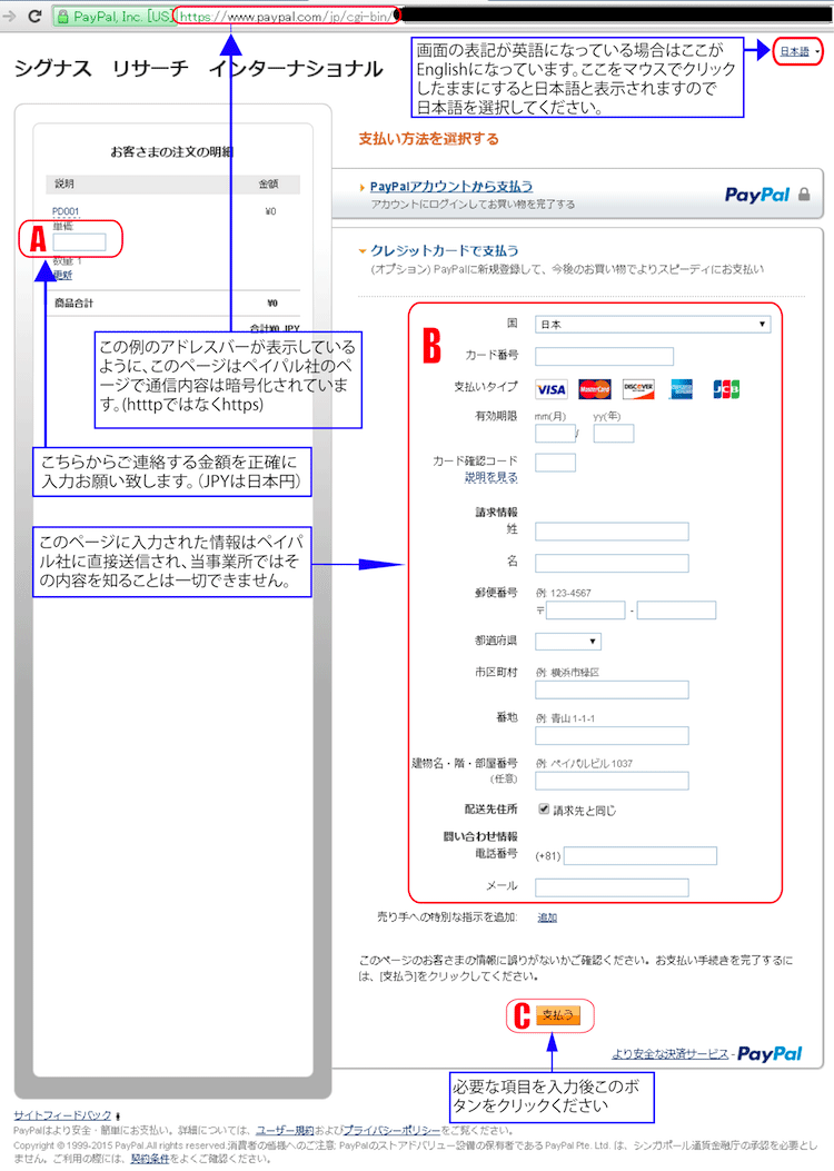 (3)お支払い金額(項目A)及びお支払い方法(項目B)を記入後、下方にあるオレンジ色で”支払う”と記されたボタン(C)をクリックください。 (4)以後はペイパル社の指示にしたがいお支払い手順を完了していただきますようお願い致します。 |