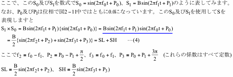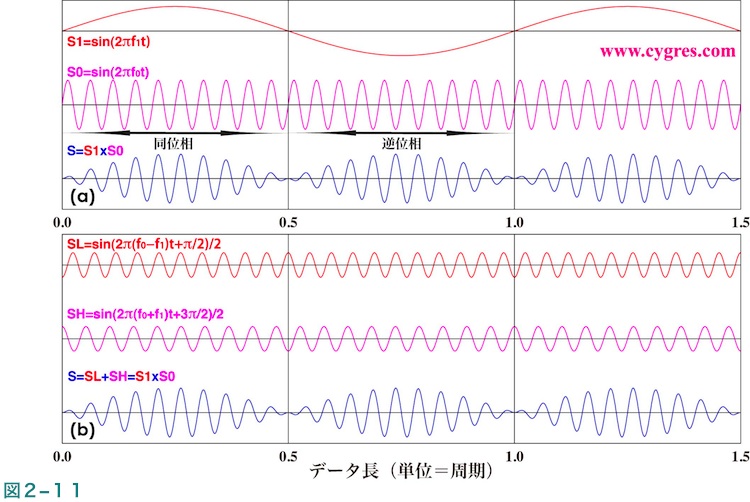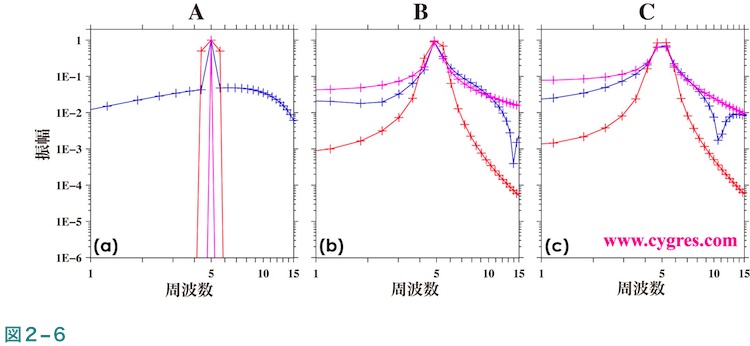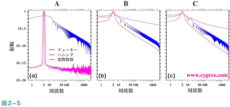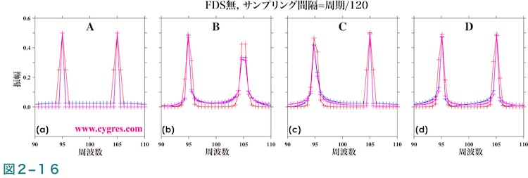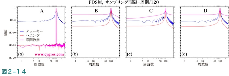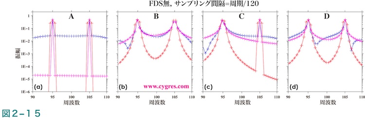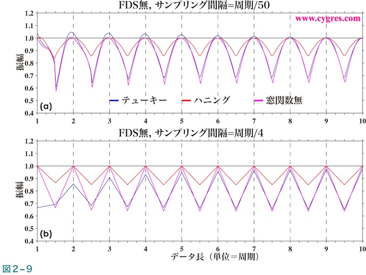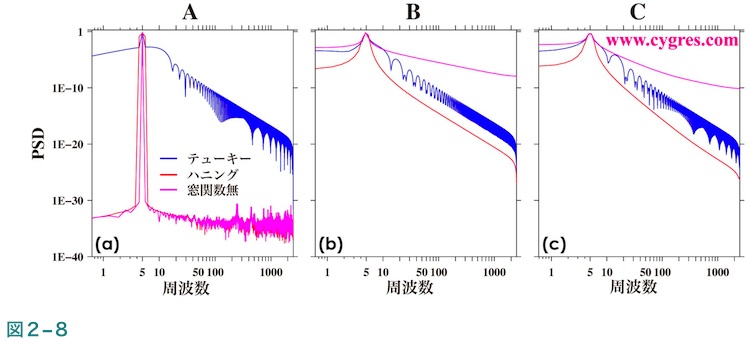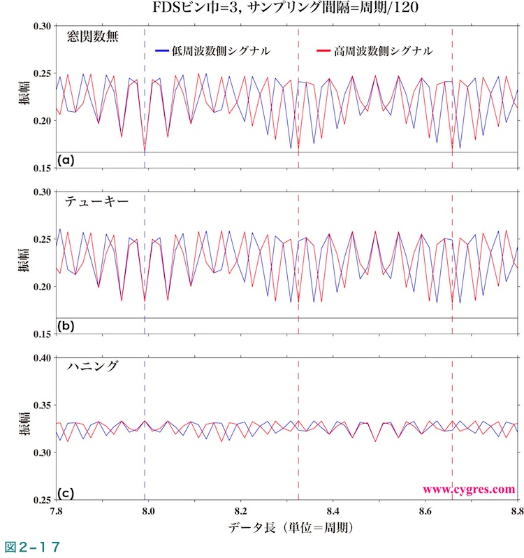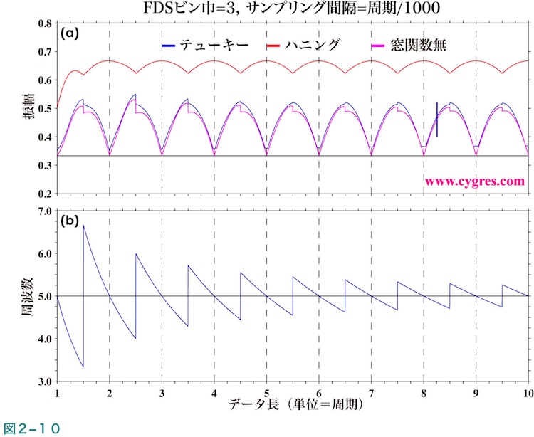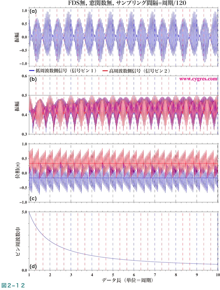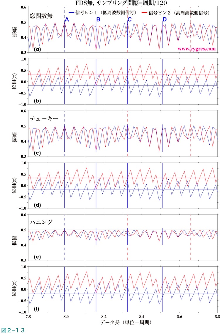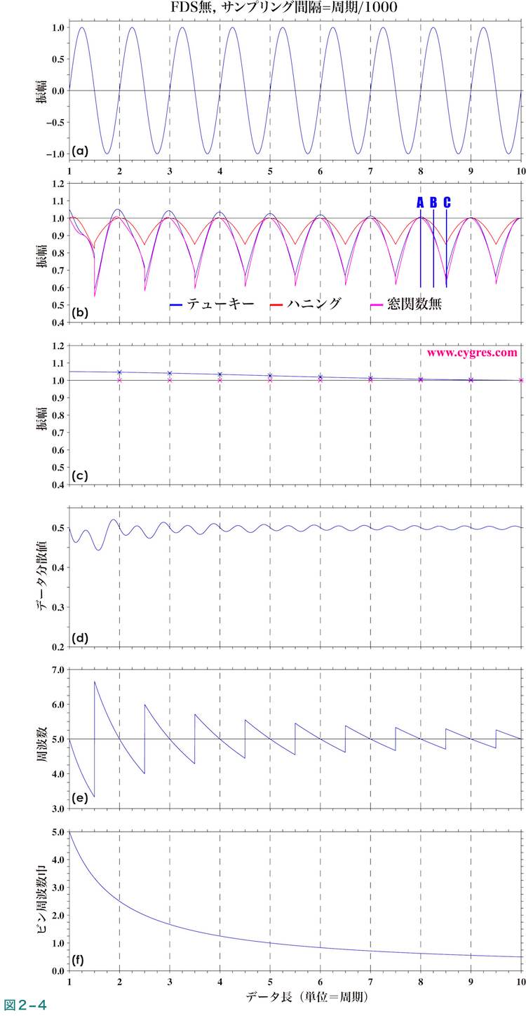 パワースペクトル密度計算 (スペクトル解析) 図を含む本文書の著作権はCygnus Research Internationalに帰属します。無断転載はお断り致します。 PD001A/B ユーザーガイド 2/7 目次 (2-1-3-3) 特定の周波数での変動の巾(大きさ)を知りたい場合 この節ではデータには信号しか含まれていない場合の結果を示します。このようなデータは現実的ではないのですが、PSDの計算によって得られる振幅(式(3)のAm)が実際の信号の振幅に比べどのようになるのか、信号の波形によってどのように変わるのかといった点を明らかにするためには好都合ですので、あえてノイズのないデータを使用しています。データにノイズが含まれている場合については(2-1-3-5)で記述致します。なお、以下に信号の波形が異なる幾つかのケースについて説明致します。 (ケース1) 信号は振幅が一定の単一の周波数の三角関数で表される場合 図2-4(b)は計算された信号ビンの振幅が、データが増えるにつれどのように変化するかを示します。図2-4(a)は横軸が単純に時間をあらわす普通の時系列図ですが、図2-4(b)およびそれより下の各図の横軸は個々の計算を行った際のデータの長さをあらわします。具体的には横軸の値が2.0の値は2000個のデータ使用した結果の値で、横軸の1.0の目盛りの間には500回の計算結果が含まれます(図全体では4501回x3窓関数、計13503回の計算結果を示します)。なお、この図を作成するための計算においては(4-1-3)に記述するような理由でトレンドの除去は行っていません。また、この図および以下に示す各図では縦軸の単位は明確にする必要が無い場合が多いので、無記入としています。 図2-4(b)中の黒の水平の実線は信号の実際の振幅(1.0)を示します。図中の青色の短い縦の実線で示したデータ長A、B及びCでのPSDや振幅スペクトルは後ほど示します。図中の縦の黒の破線(水平1.0間隔で計8本)は信号ビンの中心周波数が信号の実際の周波数に一致している場合のデータ長(本ケースではサンプリング間隔が固定されていますのでデータ長のみでPSDおよび振幅計算の周波数が決まります)の位置を示します。なお、このように信号ビンの中心周波数が信号の実際の周波数に一致している場合を以下では周波数一致と略します。 周波数一致を成立させるためには既存のデータではサンプリング間隔は変えられませんので、PSDを計算する時点でデータ数を調節します。具体的にはPSDの計算は(2-1-2-1)で記述したように1/(サンプリング間隔xデータ数)という周波数間隔で行われますが、信号の周波数がfである場合はf x (サンプリング間隔xデータ数)が整数になるようにデータの数を減らすか、あるいは値が0のデータを追加します。なお、値が0のデータを追加する処理をゼロパッディングと呼びます。例として信号の周波数が1.5サイクル/秒(1.5Hz)、データの個数が198でサンプリング間隔が0.5秒とします。このデータをすべて使うと1.5x(198x0.5)=148.5となり、この値は整数ではないのでどのビンの周波数も信号の周波数と一致しません。しかしデータを2個減らして196個にすると1.5x(196x0.5)=147なので周波数一致が成立します。また、2個ゼロパッディングを行いデータの個数を200個にすると1.5x(200x0.5)=150となり、この場合も周波数一致が成立します。 図2-4(c)は図2-4(b)と同様ですが周波数一致が成立している場合のみを抽出してプロットした図です。また、図2-4(d)はデータの分散がデータの長さによってどのように変化するかを示します。図2-4(e)は信号ビンの周波数を示す図で、図中の黒の実線は実際の信号の周波数を示します。図中で、縦の黒の破線と青の線(信号ビンの周波数)が交わる点は黒の実線(実際の信号の周波数)も交わっていることが分かりますが、これが周波数一致です。図2-4(f)はビンの周波数巾で周波数解像度と同じです。この値はPSDや振幅スペクトルのピークを信号の周波数と推定した場合に、推定した周波数と実際の信号の周波数との差の範囲を示します。これらの図により、データを増やすにつれビンの周波数巾は狭くなり周波数の推定値はより正確になることがわかります。ただし、データを増やすことによる信号の周波数推定の改善の効果はデータ数が少ない場合は大きいのですが、データ数が元々多い場合はあまり無いことがわかります。 ここで、図2-4(b)に戻ります。この図により信号ビンの振幅は周波数一致が成立した場合(縦の黒の破線の位置)は実際の信号の振幅にほぼ一致し、それ以外の場合は実際の信号の振幅より小さくなることがわかります。ここで、信号ビンの振幅を実際の信号の振幅の推定値とすると、このように周波数一致が成立しないと信号の振幅推定値は実際の値と一致しなくなるのですが、これはコンピュターで計算を行う場合に常に生じる計算の誤差ではありません。周波数一致が成立する場合は、(2-1-2-6)の式(3)の右辺中で信号ビンのAmの値は実際の信号の振幅と同じになり、他のAmの値は計算誤差の範囲内でゼロになります。しかし周波数一致が