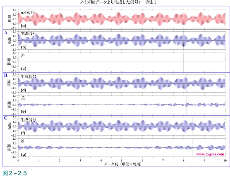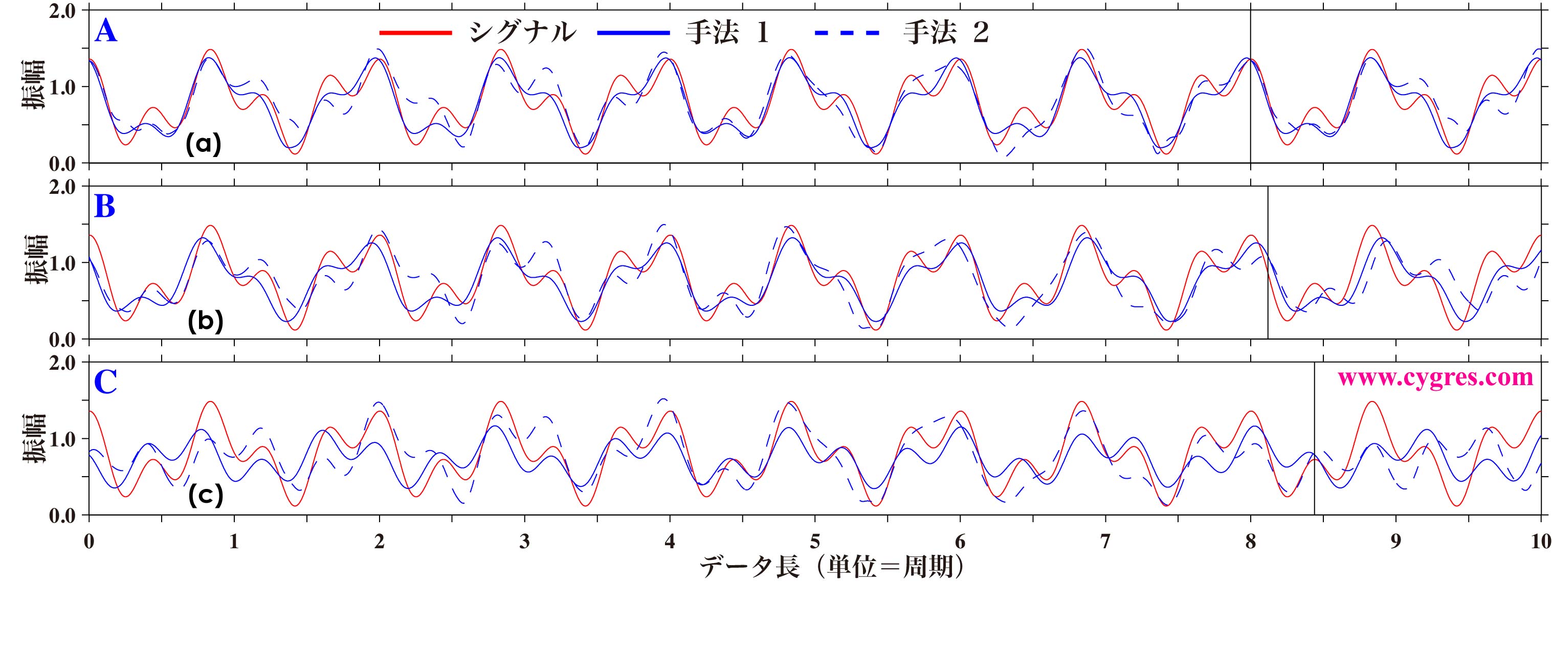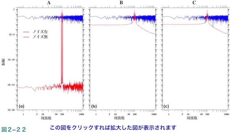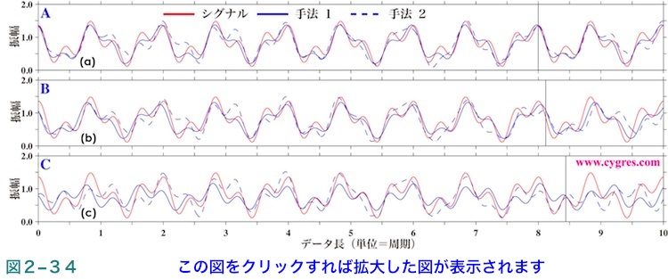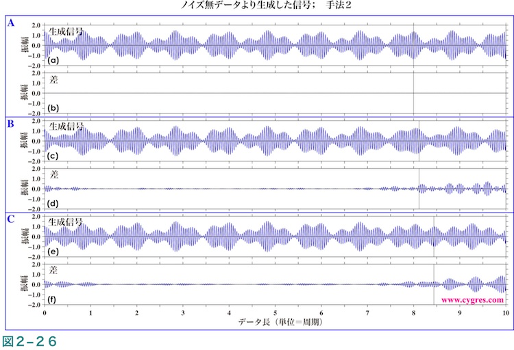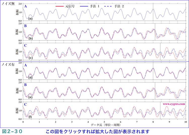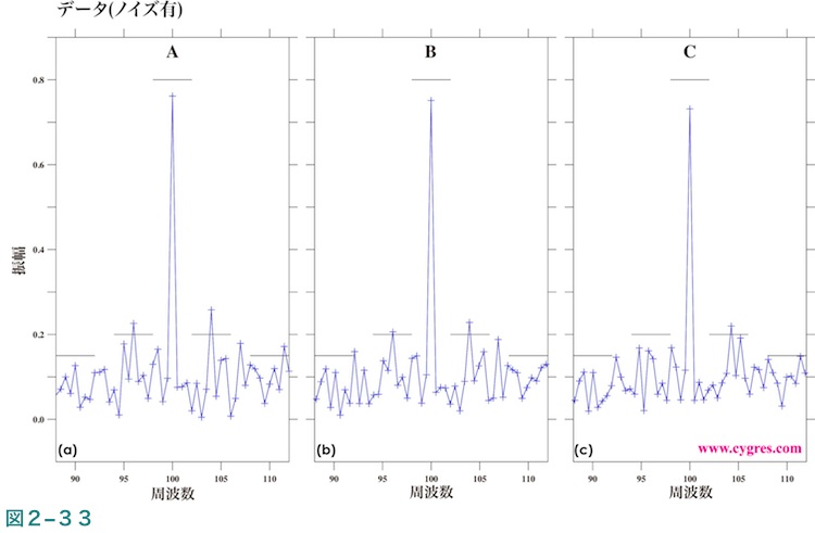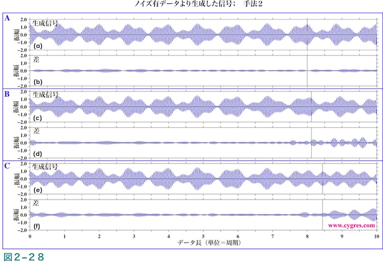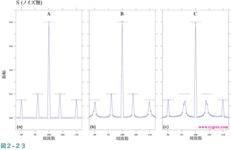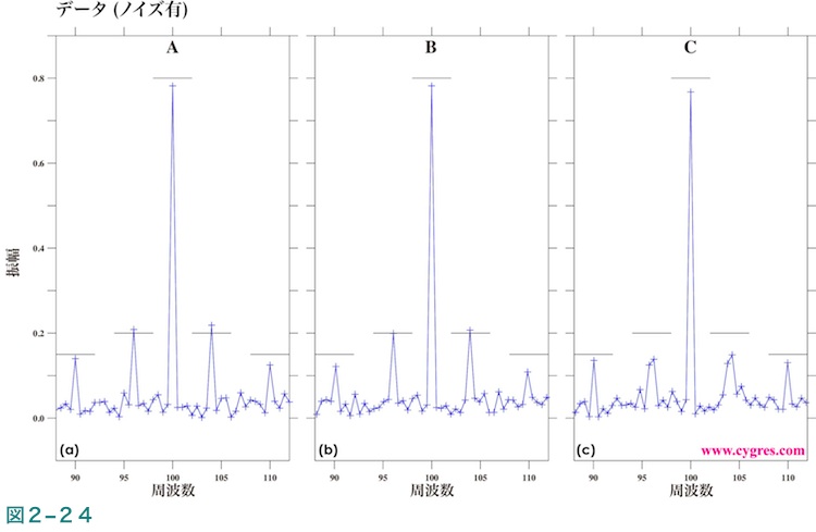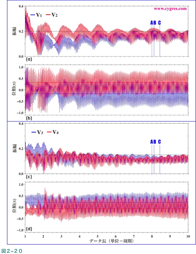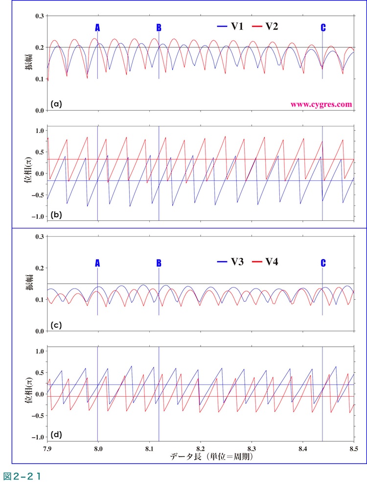 パワースペクトル密度計算 (スペクトル解析) 図を含む本文書の著作権はCygnus Research Internationalに帰属します。無断転載はお断り致します。 PD001A/B ユーザーガイド 3/7 目次 (2-1-3-4) 特定の周波数域内の変動が全体の変動と比べてどの程度強いのかを知りたい場合 (2-1-3-5) 簡易デジタルフィルター(PD001Aのみ適用) ここで、HPF、BPF及びLPFの各フィルタの通過周波数域を足し合わせると元データの全周波数域を含むことになるので、図2-18(a)に示したフィルタ適用後の時系列を全部足し合わせると基本的には元データが再現されることになります。図2-18(b)に示すのはそのようにして再現した元データと実際の元データの差の時系列ですが、これは前述した数値計算上の計算誤差になります。元データの最大値は100.0を越え、また標準偏差は約31.9ですので、それに比べれば図2-18(b)に示す計算誤差は通常の用途では無視できるほど十分に小さいことがわかります。 このようなフィルタ操作の応用として、ノイズを含んだデータから信号を抽出する操作が考えられます。ここでは最初に比較的ノイズの強度が弱い場合の例を示します。ここで使用するテストデータは(2-1-3-3)のケース3-2に類似したもので、下のようになります。 この式中でD0、D1、D2、f0、f1、f2、P0、P1及びP2はすべて定数です。このデータは信号としては下の式(8)のように5つの周波数の信号が含まれています。 図2-19(a)にここで使用する信号(S)、ノイズ(N)、及びデータ(S+N)の時系列を示しますが、式(8)中の各定数はD0=0.8、D1=0.4、 D2=0.3、 f0=100、 f1=4、f2=10、P0=0.25、P1=2.35及びP2=1.14としています。なお、各時系列は0の位置を少しずつ縦にずらしていて、これまでの例と同様に縦軸の単位は省略しています。ノイズは標準偏差が1.0になるような乱数で代用していますが、これにより図2-19(a)で示されるようにノイズの強さは信号の振幅と概ね同程度となっています。なお、図2-19(a)の水平軸の単位は1/f1(下の式(10)のV1の周期)です。図2-19(b)は信号S及びデータの最初の部分を拡大した図で、両者の山(または谷)の位置を比較すると、データに信号が含まれていることがわかります。 ここで信号に関してV0、V1、V2、V3及びV4を以下のように定義します。 この定義により式(7)は以下のように簡潔に表現できます。 ここで、V0の周波数を含むビンを信号ビン0、V1の周波数を含むビンを信号ビン1のように定義します。図2-20(a)及び(b)は信号ビン1及び2の振幅及び位相がデータが増えるにつれどのように変化するかを示します。これらの図の水平軸の単位(図2-20(d)の下に表記)はV1の周期で、最初の1周期分は結果の変動が大きいので省略しています。V1およびV2の実際の振幅は同じ(=D1/2)で図2-20(a)中には黒の水平の実線で示しています。実際の位相についてはV1とV2では値が異なりますので、図2-20(b)中にはそれぞれ青色と赤色の水平の実線で示しています。図2-20(c)及び(d)は信号ビン3及び4の図である以外は(a)及び(b)と同じです。これらの図の詳細はかなり見にくいのですが、図の右端近くでは計算結果が比較的安定した同一パターンの繰り返しになっていることがわかります。図2-20(a)及び(c)中の青色の縦の実線で示したデータ長A、B及びCでの振幅スペクトル等は後で示します。なお、V0についてはここでは省略しています。 図2-21はデータ長7.9から8.5迄の間のみ取り出し水平方向に拡大した信号ビンの振幅及び位相の図で、図中の垂直や水平の実線の意味は図2-20と同じです。データ長がAの場合はすべての信号ビンについて周波数一致が成立していますが、図2-13で示した結果と異なり、ノイズのため信号ビンの振幅は実際の信号の振幅に一致していません(図2-21(a)及び(c))。なお、データ長Bはすべての信号ビンについて周波数一致が成立していない場合で、データ長Cは信号ビン3及び4の周波数はかなり実際の信号の周波数に近い場合です。 図2-22にデータ長がA、B及びCの場合の窓関数非適用の振幅スペクトルを示します。なお図の青線は式(7)や(10)のようにノイズを含むデータより計算した結果で、赤線は式(8)のようにノイズを含まない信号だけのデータから計算した結果です。この図の青線のスペクトルよりここで使用したノイズそのもののスペクトルは全周波数領域で比較的平坦なものであることがわかります。なお、描画の際には先に青線を描いてから赤線を描いているため、青線と赤線の位置が一致するような所では青線の上に赤線が上書きされています。 データ長がAの場合は周波数一致が成立していますので、ノイズを含まないデータ(赤線)については(4-2-1)で記述するように信号のスペクトル漏れがないケースで、図2-22(a)でも図2-5(a)と同様に信号のある周波数以外では振幅は実質ゼロになっています。ただし一般的には異なった周波数の複数の信号が存在する場合はこのケースのようにすべての信号について周波数一致を成立させるのは困難です。ここで示す例の場合はすべての信号について周波数一致が成立できるよう