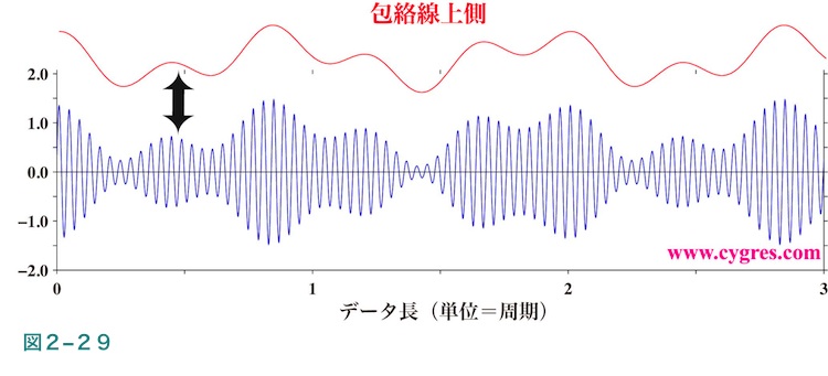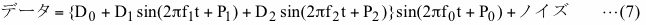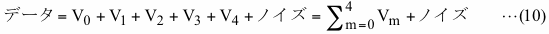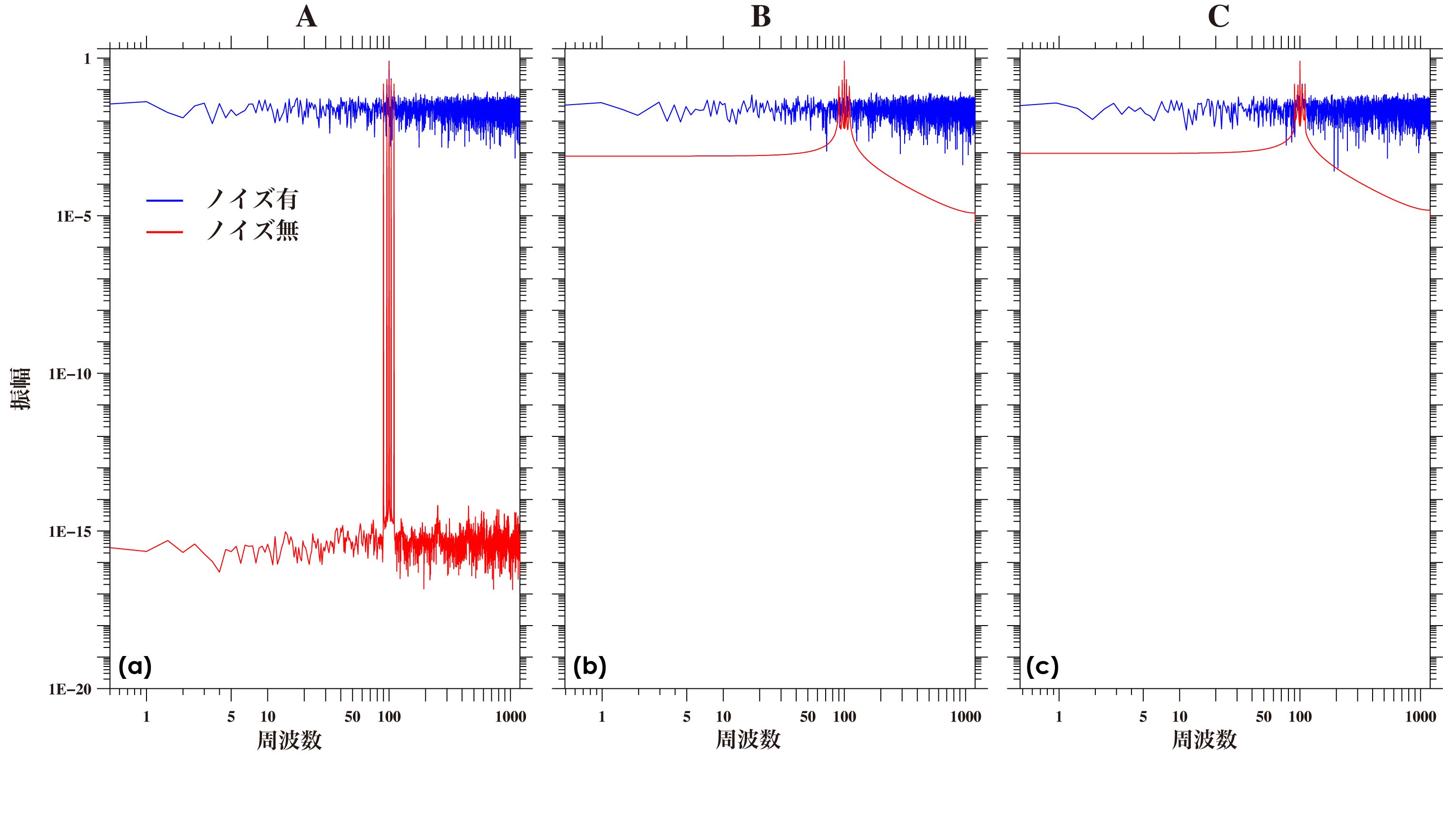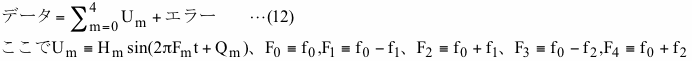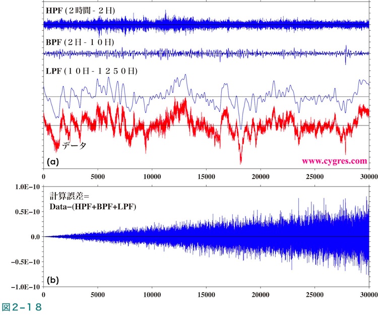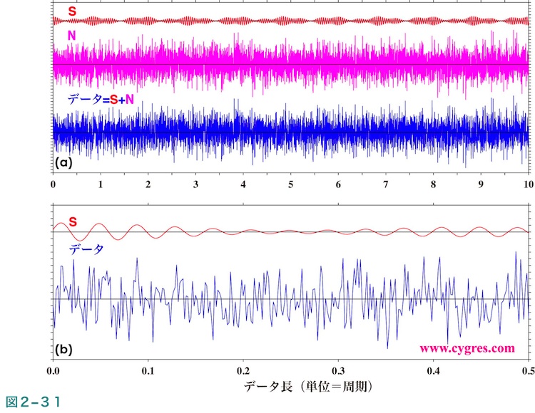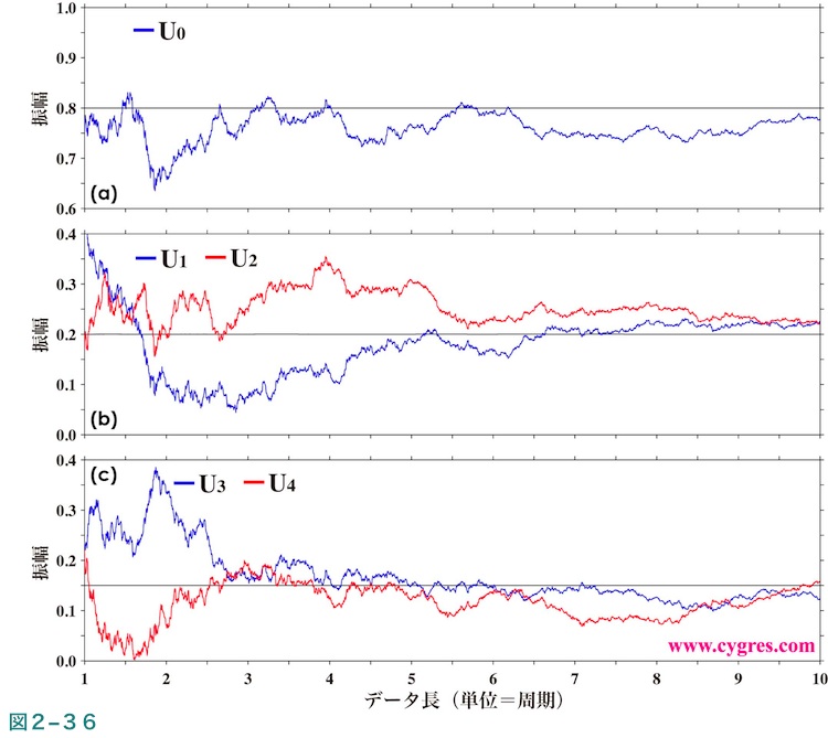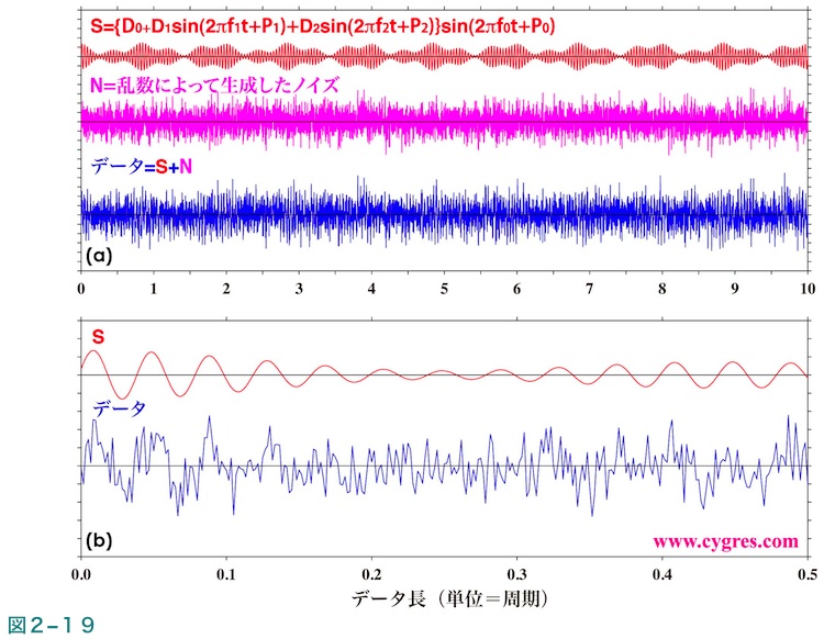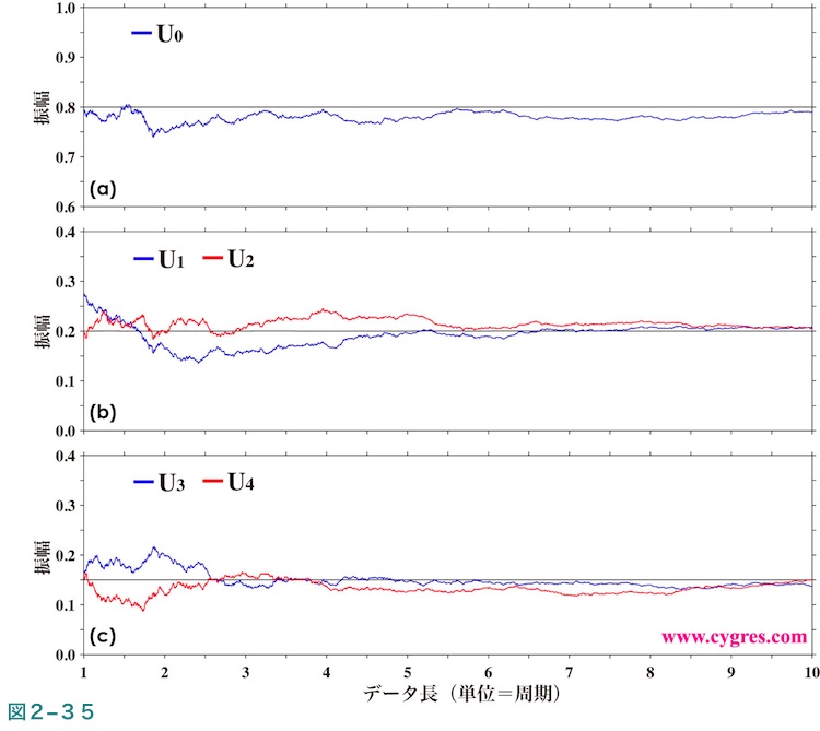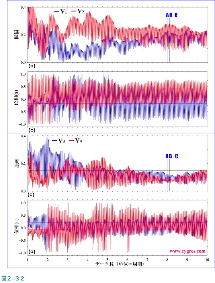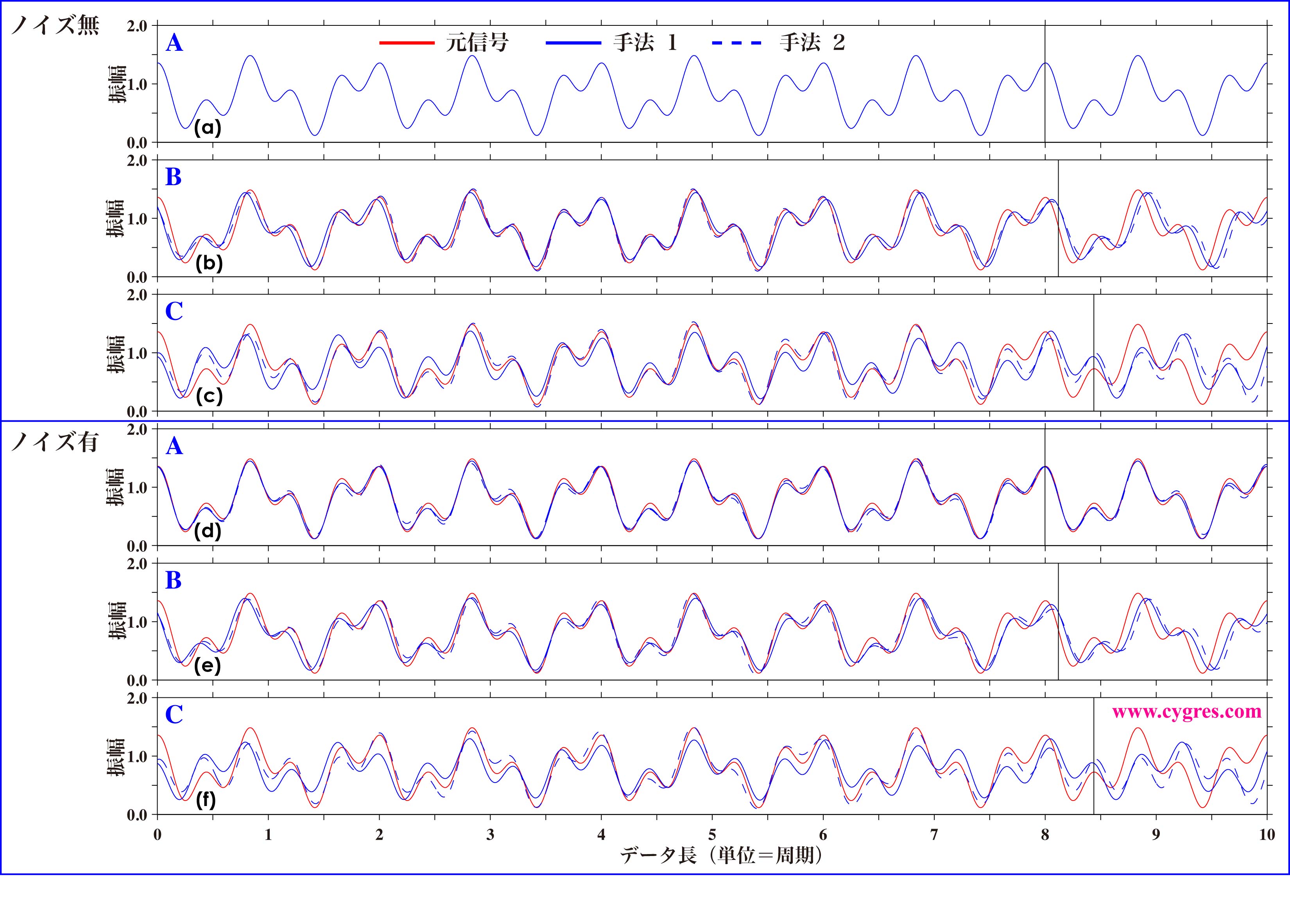 パワースペクトル密度計算 (スペクトル解析) 図を含む本文書の著作権はCygnus Research Internationalに帰属します。無断転載はお断り致します。 PD001A/B ユーザーガイド 3/7 目次 (2-1-3-4) 特定の周波数域内の変動が全体の変動と比べてどの程度強いのかを知りたい場合 (2-1-3-5) 簡易デジタルフィルター(PD001Aのみ適用) ここで、HPF、BPF及びLPFの各フィルタの通過周波数域を足し合わせると元データの全周波数域を含むことになるので、図2-18(a)に示したフィルタ適用後の時系列を全部足し合わせると基本的には元データが再現されることになります。図2-18(b)に示すのはそのようにして再現した元データと実際の元データの差の時系列ですが、これは前述した数値計算上の計算誤差になります。元データの最大値は100.0を越え、また標準偏差は約31.9ですので、それに比べれば図2-18(b)に示す計算誤差は通常の用途では無視できるほど十分に小さいことがわかります。 このようなフィルタ操作の応用として、ノイズを含んだデータから信号を抽出する操作が考えられます。ここでは最初に比較的ノイズの強度が弱い場合の例を示します。ここで使用するテストデータは(2-1-3-3)のケース3-2に類似したもので、下のようになります。 この式中でD0、D1、D2、f0、f1、f2、P0、P1及びP2はすべて定数です。このデータは信号としては下の式(8)のように5つの周波数の信号が含まれています。 図2-19(a)にここで使用する信号(S)、ノイズ(N)、及びデータ(S+N)の時系列を示しますが、式(8)中の各定数はD0=0.8、D1=0.4、 D2=0.3、 f0=100、 f1=4、f2=10、P0=0.25、P1=2.35及びP2=1.14としています。なお、各時系列は0の位置を少しずつ縦にずらしていて、これまでの例と同様に縦軸の単位は省略しています。ノイズは標準偏差が1.0になるような乱数で代用していますが、これにより図2-19(a)で示されるようにノイズの強さは信号の振幅と概ね同程度となっています。なお、図2-19(a)の水平軸の単位は1/f1(下の式(10)のV1の周期)です。図2-19(b)は信号S及びデータの最初の部分を拡大した図で、両者の山(または谷)の位置を比較すると、データに信号が含まれていることがわかります。 ここで信号に関してV0、V1、V2、V3及びV4を以下のように定義します。 この定義により式(7)は以下のように簡潔に表現できます。 ここで、V0の周波数を含むビンを信号ビン0、V1の周波数を含むビンを信号ビン1のように定義します。図2-20(a)及び(b)は信号ビン1及び2の振幅及び位相がデータが増えるにつれどのように変化するかを示します。これらの図の水平軸の単位(図2-20(d)の下に表記)はV1の周期で、最初の1周期分は結果の変動が大きいので省略しています。V1およびV2の実際の振幅は同じ(=D1/2)で図2-20(a)中には黒の水平の実線で示しています。実際の位相についてはV1とV2では値が異なりますので、図2-20(b)中にはそれぞれ青色と赤色の水平の実線で示しています。図2-20(c)及び(d)は信号ビン3及び4の図である以外は(a)及び(b)と同じです。これらの図の詳細はかなり見にくいのですが、図の右端近くでは計算結果が比較的安定した同一パターンの繰り返しになっていることがわかります。図2-20(a)及び(c)中の青色の縦の実線で示したデータ長A、B及びCでの振幅スペクトル等は後で示します。なお、V0についてはここでは省略しています。 図2-21はデータ長7.9から8.5迄の間のみ取り出し水平方向に拡大した信号ビンの振幅及び位相の図で、図中の垂直や水平の実線の意味は図2-20と同じです。データ長がAの場合はすべての信号ビンについて周波数一致が成立していますが、図2-13で示した結果と異なり、ノイズのため信号ビンの振幅は実際の信号の振幅に一致していません(図2-21(a)及び(c))。なお、データ長Bはすべての信号ビンについて周波数一致が成立していない場合で、データ長Cは信号ビン3及び4の周波数はかなり実際の信号の周波数に近い場合です。 図2-22にデータ長がA、B及びCの場合の窓関数非適用の振幅スペクトルを示します。なお図の青線は式(7)や(10)のようにノイズを含むデータより計算した結果で、赤線は式(8)のようにノイズを含まない信号だけのデータから計算した結果です。この図の青線のスペクトルよりここで使用したノイズそのもののスペクトルは全周波数領域で比較的平坦なものであることがわかります。なお、描画の際には先に青線を描いてから赤線を描いているため、青線と赤線の位置が一致するような所では青線の上に赤線が上書きされています。 データ長がAの場合は周波数一致が成立していますので、ノイズを含まないデータ(赤線)については(4-2-1)で記述するように信号のスペクトル漏れがないケースで、図2-22(a)でも図2-5(a)と同様に信号のある周波数以外では振幅は実質ゼロになっています。ただし一般的には異なった周波数の複数の信号が存在する場合はこのケースのようにすべての信号について周波数一致を成立させるのは困難です。ここで示す例の場合はすべての信号について周波数一致が成立できるよう