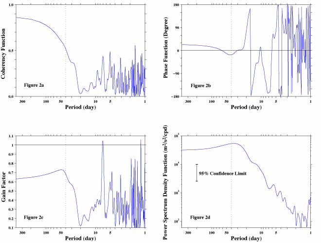 Figure 2a shows coherency function. The coherency is over 0.8 at long periods (low frequency) but it starts dropping rather fast as period decreases. It becomes 0.5 at about 40-day period (dotted black vertical line) and it hits floor at about 20-day period. From there it changes rapidly but stays low as period further decreases. Thus, coherency function shows what appears to be highly correlated these two sets of time series are actually highly coherent only at period longer than about one month. Figure 2b shows phase function and horizontal black line indicates 0 degree (no phase/time lag between these data). The phase changes the sign within a range where the coherency is high. This means that the variations of current at 156E lagged behind those at 165E at very long periods but the order changes at about 60-day period. However, the phase at period longer than about 25-day is not statistically significantly different from zero. The gain factor, figure 2c shows that the amplitude of variations at 165E is smaller than that at 156E at almost entire period range (values are less than 1.0). There is a slight tendency that amplitude of variations at 165E relative to that at 156E increases as period decreases within a range where coherency is high. Finally, figure 2d shows power spectral density function of the current at 156E. It is noted that there are relatively strong energy at periods shorter than 40-day period. This suggests that those variations at periods where the coherency was low are not negligible. |