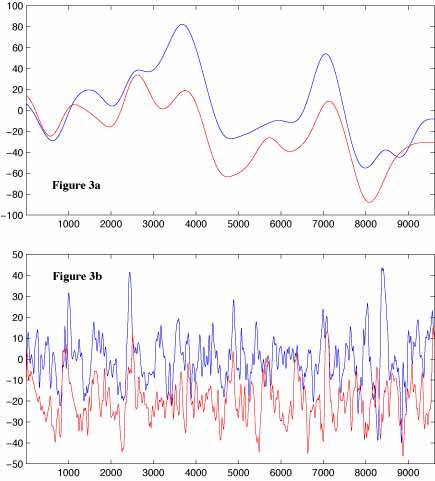 This might be expected from figure 2b. Figure 3b shows time series plots of these current data after applying a band-pass filter, which allows 40- to 2-day period variations. Except for first 3000 data, they don't look resemble each other (the maximum lagged correlation coefficient is 0.26) . Even about those first 3000 data, only the long period variations are similar and it might not be a surprise because the coherency is about 0.5 at 40-day period. The important point here is that the amplitudes of variations shown in figure 3b are not very small compared with those shown in figure 3a as suggested by figure 2d and, thus, they are not negligible despite of our initial impression after seeing figure 1. | ||||||||||||||||||||||||||||