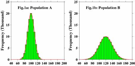| Now returning to our examples, the mean and the standard deviation of population A are 100.0 and 10.0 and of population B are 120.0 and 20.0, respectively. We extracted 500 data from each of these two populations. Figure 2 shows frequency distributions of these samples. Let us call them sample A (Fig. 2a) and sample B (Fig. 2b). The average and the standard deviation of sample A are 99.34 and 9.43 and of sample B are 119.76 and 19.66, respectively. The 95% confidence intervals for these sample averages are +/- 0.83 (or between 98.51 and 100.17) for the sample A and +/-1.73 (or between 118.27 and 121.73) for the sample B. Here, we computed these intervals from sample standard deviations because it is quite unlikely that we know the standard deviation of the population when we try to estimate average of it in the real world unlike our examples. These results show that the averages of population A and B both fall within the confidence intervals for sample averages. The confidence interval for sample average B is wider than that for sample average A as you might have noticed. This is because the data of sample B tend to scatter more than those of sample A which resulted that the standard deviation of sample B is larger than that of sample A. This, in turn, resulted that the uncertainty of sample average B as an estimation of population average B is larger and, thus, confidence interval becomes wider. |