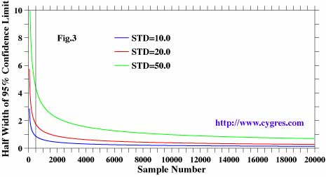 | Now, let us see how certain the confidence level, "95%" of 95% confidence interval, actually is. We made 200 experiments, in each of which we extracted 500 data from population A, and then computed confidence interval for sample average each time. All the data in the population A were used once but never reused in these experiments (100000/500=200). The result of this trial was that the true average fell within the confidence interval for the sample average for 192 times. This is 96% of entire experiment and this experiment shows that the number 95 of 95% confidence interval itself has an uncertainty in the realistic situations. Thus, it usually does not make that much sense to compare confidence intervals of, say, 95% and 96%. How many samples do we need? The number of samples you extract from population also affects the confidence interval for the sample average. Figure 3 shows how the half width of the 95% confidence interval for sample average changes as the number of sample changes. The standard deviation is fixed and we computed for three cases. This figure shows that the confidence interval decreases rapidly as the number of sample increases initially. Decrease of confidence interval means you can get more accurate estimate of true average. However, this trend slows down as you extract more samples from population and, eventually, the confidence interval would not decrease that much any more. Your effort to obtain more data will not be rewarded that much at that point. Therefore, you have to have a strategy to know just how many samples you need to have because obtaining data usually costs some money. You have to have three numbers to know how many samples you need. First of all, you have to specify the confidence level. We customary choose 99, 95 or 90% as described before. Next, you have to determine how much possible difference between sample average and true average, the width of confidence interval, you can accept. At this point you basically have determined the certainty/accuracy of sample average you can have. Then, you need to have an estimate of standard deviation of population. You can estimate it based on past experiences or just give a rough estimate. From these three numbers you can draw a figure similar to figure 3 and estimate how many samples you need to accomplish your task. If you are not so sure about your estimate of standard deviation of population, you could repeat computations with the different value of standard deviation of population and make your decision based on those results along with your financial resource. Figure 3 indicates that 500 samples (the vertical black line) were enough for population A but we probably needed more samples for population B in our examples |
