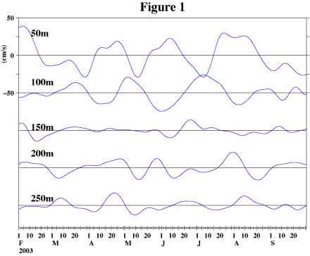 (3) We might need to do some pre-processings before computing EOF In case of our example we know that there are strong tidal signals in our data. We know also that there are variations of periods of half a year and one year. We are not interested in these variations. Also, we have an idea at which frequencies wind has strong influences on ocean currents through coherency analysis. Thus, we applied a band-pass filter to our data before computing EOF based on this prior knowledge. We used a combination of classical numerical filters called Butterworth filter but there are many other numerical filters. It is also possible to use more modern methods such as wavelet analysis. Another important point here is that a specific external factor might have influences to our data by several different mechanisms via different routes. The responses caused by the same external factor but by different mechanisms might have different characteristics. For example, certain mechanisms might dump variations of shorter period while others might dump variations of longer period. It might become difficult to interpret time series data sets produced by EOF as a result of that. Wind affects ocean currents on the equator in several different ways in our example. We have a theoretical reason to believe that the mechanisms by which wind affects to ocean current near the surface where eigenvector is positive and to ocean current at mid-depths where eigenvector is negative are different. One of the methods we can try in case like this is removing some data sets before computing EOF. So, we re-calculate EOF using data at depths only between 40m and 80m (5 time series data sets). Here, we might say we "filtered" our data based on depth (location). Figure 3b, the result of this re-calculation, shows shorter period variations such as "dual-bump" features more clearly than Figure 3a does. If we mix time series data sets with different units (units of speed, temperature and such), we usually need to adjust their amplitude unless we use a correlation matrix to compute EOF. This process is called weighting and multiplying certain constant to each of these time series data sets often does it. We usually remove average and often remove trend from each time series data set before computing EOF. Using a correlation matrix to compute EOF is equivalent to adjusting amplitude of input data by dividing input data by the square root of variance of them before computing EOF. By doing so all the time series data sets will have equal importance (weight) in EOF computation. Finally, EOF might not be able to separate variations caused by different factors especially when they are correlated for whatever the reasons. In case of ocean we have daily variations caused by tidal motions. We have another daily variation caused by solar heating during the daytime and radiation cooling during the nighttime near the surface. Periods of these variations are not exactly the same but it is quite possible that we cannot separate effects caused by these two factors by EOF. (4) The result of EOF might be meaningless. |