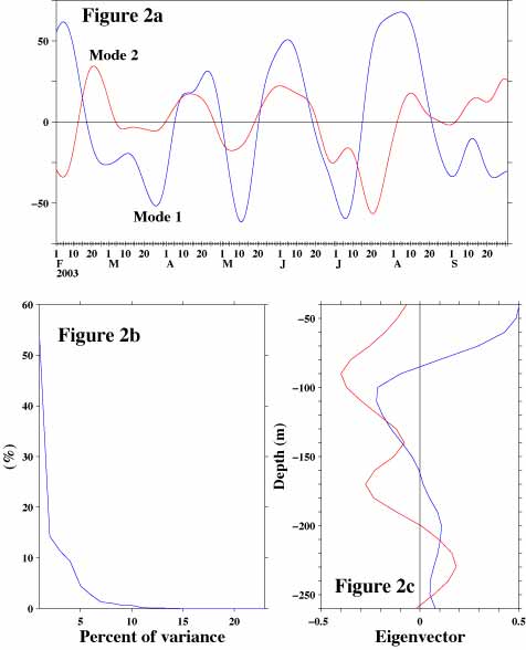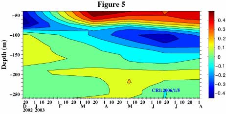 You might have noticed that the time series plots of mode 1 and mode 2 (Figure 4b) look suspiciously similar. The correlation coefficient between them is zero but it becomes 0.81 if we shift mode 2 time series data to the left by 13.3. The zero-correlation among time series data sets generated by EOF is guaranteed only if we do not shift resultant time series data at all. To avoid result like this we have to adjust data sets before computing EOF if the variations in oroginal time series data sets have time lag among them. Alternatively we might use time domain complex EOF or frequency domain EOF if we do not know how much we need to shift data. We will describe these methods later in this page. (2) Variables represented by eigenvectors and eigenvalues are supposed to be constant in time Then, what we can do to deal with this kind of problem is creating a time series of eigenvectors in the following manner. First, we picked up initial 91.25-day (1/4-year) long segment of data and then applied EOF to that segment of data. Next, we picked up another 91.25-day long segment of data starting from 91.25/2=45.625 day (0 day is the start date of entire data) and then applied EOF to this new segment of data. We repeated this procedure until we reached the end of the data. Figure 5, the result of these computations, shows how the eigenvector of mode 1 changes in time. This figure shows that mode 1 eigenvector has a two-layer structure (negative near the surface and positive below) at the beginning of the data. Then, it changes to a three-layer structure (positive near the surface, negative below to about 180m and positive again below) in the early 2003 and this three-layer structure continues to exist till the end of data. Thus, in our example (Figure 2 and 3), we picked up data starting from February 2003 but discarded data prior to that month.