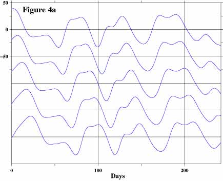 This page explains what the EOF is and how the customer can use them. This page describs a part of the data analysis services we offer at CRI. Please click "Data Analysis" button above to see other types of data analysis we offer. We prepared explanatory pages with some examples for underlined words in blue. If you want to see those pages, please click underlined words in blue below. What is EOF analysis? Why should I bother computing EOF? Since these new sets of time series data are uncorrelated each other, it is probably reasonable to assume that each set of new time series data represents different phenomenon. Then, we usually try to study each component individually. The magnitudes of eigenvalues show how important each of these new sets of time series data is. The vertical axis scale at the upper left is for the record at 50m and we moved all other records downward to make comparison easier. The zero levels for each record are shown as horizontal black lines. We downloaded these data from NOAA, U.S.A. (http://www.pmel.noaa.gov/tao) and applied a band-pass filter to remove variations of period longer than 150 days and shorter than 20 days. This figure suggests that the variations of current at 100m (2nd line from top) are inversely correlated with those at 50m (1st line) while those at 200m (4th line)might be inversely correlated with those at 100m. There are 23 sets (depths) of time series data at this location if we ignore bad data. Studying the relations among these 23 sets of time series data like this way is an overwhelming task to us. So, we applied EOF to extract coherent variations among these 23 data sets. Figure 2a shows time series plots of two major components extracted from original time series data. Let us call these components mode 1 (blue line) and mode 2 (red line) following oceanographic tradition. Although it looks like they are somewhat correlated, the correlation coefficient between these two time series data is actually zero (yes, we actually computed). Figure 2b shows how much of the variations included in the entire original time series data sets(all 23 of them) is included in each of these components. For this purpose we used statistical quantity called variance which is often considered to be related to "power" or "energy" of variations. The vertical axis of this figure is the percent of variance and the horizontal axis is the mode number (there are 23 modes). The mode 1 contains 53.5% and the mode 2 contains 14.3% of variance exists in the entire original time series data sets. This information is what we can obtain from the eigenvalues. The variance contained in each mode decreases progressively as the mode number increases. Thus, we can concentrate our analysis efforts on a few lower modes. Even if we ignore many other higher modes we would not lose that much information. In this case if we analyzed mode 1 and mode 2, then we have practically analyzed 67.8% of variations included in the original 23 sets of time series data. Our efforts/costs to analyze just only two sets of time series data would be considerably lower than our efforts/costs to analyze original 23 sets of time series data. This is why EOF is a useful tool. Figure 2c, the eigenvectors of mode 1 and mode 2, shows how the amplitude of variations shown in Figure 2a varies at different depths. The mode 1 is positive at 50m, negative at 100m and positive at 200m. This means that the variations at 100m look like mirror images of those at 50m and at 200m except that their amplitudes are different. This pattern matches our previous description of Figure 1. Other than these qualitative observation, we now know how the amplitude of variation shown in Figure 2a varies at different depths quantitatively. The information like this might help us to identify the cause of these variations. Even if we do not need to know the cause of these variations, knowing the amplitude of variations at different depths quantitatively rather than qualitatively would be probably nice. So, what is the mode 1 anyway, which includes 53.5% of variance included in the original time series data? Figure 3a shows time series plot of mode 1 (blue line) and east-west wind speed (red line) at 147.5E on the equator obtained from NOAA, U.S.A. (http://www.cdc.noaa.gov/cdc/reanalysis). This figure suggests that mode 1 variations of ocean current at this location are related to the wind speed variations. The variations of ocean current lag behind those of wind. The value of the correlation coefficient reaches its maximum, 0.68, when we shift wind data to the right by 9 days. We computed 95% confidence interval assuming that effective sampling interval is 10 days since the cut-off period of a band-pass filter we applied is 20 days, and this correlation is statistically significant (meaningful). From figure 2c wind influence is such that the ocean current near the surface and at depths below 160m is accelerated in the down-wind direction but it is accelerated against wind direction at depths between about 80 and 160m. We will stop our analysis at this point since this is not a scientific paper, but we would like to mention that we published results of more detailed analysis applied to the older data at the same location in a scientific journal. 1-3 Some cautions of using EOF (1) This type of EOF cannot deal with phase or time lag among time series data sets. Figure 4a shows the data sets for the second experiment. The first time series data (top) is the one at 50m. The second time series data is the same as the first one except that we shifted it backward (to the right on a time series plot) by 5-days. We shifted the third one by another 5-days, totally 10-days. We generated the fourth and the fifth time series data in a similar manner.