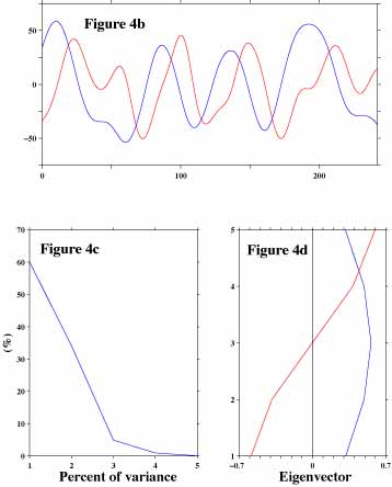 Figure 4b shows time series plots of mode 1 (blue line) and mode 2 (red line). Figure 4c shows eigenvalues of this experiment. Mode 1 contains only about 60% and mode 2 contains about 34% of variance of the input data sets. This result indicates that mode 2 is no longer negligible. Figure 4d shows eigenvectors of mode 1 and mode 2. Mode 1 has amplitude variations at different "depths" (not a straight vertical line) although all the time series data are exactly the same except for the time shift among them.