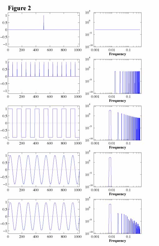 | Is power spectral density function always useful? Graphs of PSD such as Figure 1a quite often give us useful information but we need some cautions to interpret them in certain cases. The left panels of Figure 2 show plots of five different sets of time series data and the right panels of Figure 2 show PSD of those. The thin horizontal lines in the left panels indicate zero level. The single pulse (top row) in the middle of the time series, although its location is unimportant, results flat PSD across the entire frequency range. This is what the theory says. If your data have a strong spike-like noise somewhere, that spike might boost energy level everywhere and make everything else obscure. The periodic spike signal (second row) produces multiple peaks, called harmonics, on PSD although actual frequency of occurrence of spikes is not multiple but one specific frequency. You might have this kind of data when your data are contaminated by sparks caused by some kind of rotational machinery such as a motor. If your data have a shape of rectangular wave (third row), you will get harmonics again on PSD. You might encounter a pattern like this if you measure clock outputs of logic circuits. Is this a problem? If you want to know the frequency of rectangular waves as rectangular waves instead of summations of sinusoidal waves, probably yes. However, if you want to know how much bandwidth is necessary for your digital data transmission, the answer might be no. The pattern of digital data is usually not as regular as the example we show here. All of these confusing results occur from the fact that PSD is basically trying to decompose input data into a series of sinusoidal waves (4th row is a case of sinusoidal wave) of different frequencies. It requires many high frequency sinusoidal waves to reproduce input data properly when input data have signals that have shapes nowhere close to a sinusoidal wave, especially when they have sharp corners. If input data have a shape of a pure sinusoidal wave (4th row), PSD shows its frequency nicely. The peak of PSD in this figure is not a single point sharp peak (usually called line spectrum) but it has a width of three frequency points. This is because we applied a "spectral window" (we called FDS here) which is necessary to evaluate confidence interval of amplitude but it makes peaks broader. There is a trade off between the accuracies of the estimation of amplitude and of frequency. "Raw spectral"(the result before applying a spectral window) shows a peak at one frequency (band) in this case. Next, we cut off peaks of this sinusoidal wave so that it has flat tops with sharp corners as a final example (5th row). The amplitude of the signal shown in the 4-th row is 1.0. We clipped values above 0.95 and below -0.95. Situation like this might occur when you have a beautiful sinusoidal wave as an input to your amplifier but the amplitude of the input is too large for your amplifier. Casual look of a time series plot might miss this saturation but PSD would probably remind you about it.