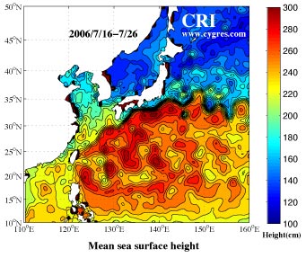 The left figure above shows sea surface height averaged over the period of July 16 through July 26, 2006. The data were obtained from AVISO, France where data from several satellites, such as Topex/Poseidon, Jason-1, ERS and ENVISAT were utilized to construct a global sea surface height data set with 1/3 degree spatial interval both in latitude and in longitude with 3-day time interval. The contour interval of this figure is too small near the Kuroshio which lies along the area where the sea surface slope is steep, and the Kuro(Black in Japanese)shio(Tide and current in Japanese) south and east of Japan literally appears as a black river. We made figures of monthly mean sea surface height near Japan from September 2001 to June 2006. Please click the year below to see those figures. |