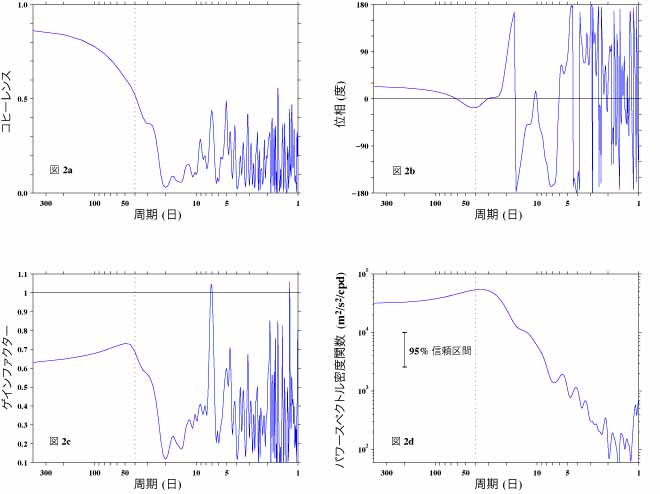 そこで、図2aにこの両データ間のコヒーレンスを示します。コヒーレンスは長周期の部分では0.8以上ですが、周期が減少するにつれ急激に減少し、周期約40日(縦の黒破線)で約0.5になり、周期約20日で最低となります。それ以下の周期では値は大きく変動しますが、低いままです。この図より、両データで関連が高いのは長周期の変動のみということがわかります。 |