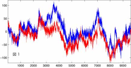 ここではそれぞれの時系列で9620個のデータがありますが、図を見やすくするために赤線を縦方向に少しずらしてあります。この図を一見すると、156度と165度の流速は非常に関連が高いという印象を受けます。ただし、こういった図の場合、私たちはどうしても目立つ変動に注目してしまい、この例では一ヶ月(横軸目盛りで24x30=720)から数ヶ月のの変動に目を奪われがちです。 | |||||||||||||||||||||||