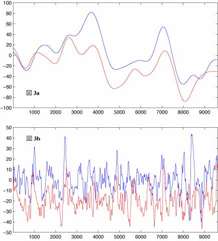 次に図2bに位相を示します。この図で黒の実線は位相がゼロであることを示します。図2aでコヒーレンスが高かった部分では位相は周期の長いところでは正で、周期が減少すると負になっていますが、これらの値は統計的には位相差があるとは言えません。言い換えれば、統計的には両者間に位相差は無いといっても良いということです。なお、正値は165度での変動が156度での変動に先行することを意味します。 図2c は周波数応答関数より得られるゲイン要素を示します。これは変動の両者間の振幅比を示します。この図より165度の変動は156度での変動よりほぼ全周波数域で小(値が1.0より小)であることがわかります。なお、両者間のコヒーレンスの高い部分では、165度の変動は周期が減少するにつれ相対的にやや大きくなる傾向があるようです。 図2dは156度のデータのパワースペクトル密度関数を示します。この図によれば周期40日以下の変動も決して著しく小さいわけではないことがわかります。したがってコヒレーンスが小さい部分の変動も決して無視できない可能性を示します。 図3aは周期40日以下の変動をカットするローパスフィルタを適用した後のデータの時系列プロットです。この図により、周期40日以上の変動は両データで非常によく似ていることがわかります。なお、相関係数は時間差を与えてやると最大で0.84となります。 |
