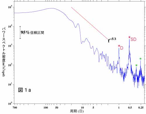 お取り扱いするデータの形式、計算内容、計算結果の内容及び形式やデータ授受方法といった業務全般を定型化することでコスト削減及び納期短縮を図った低価格のスペクトル密度計算サービスを開始致しました。詳細は->ここ<-をクリックください。 このページは当事業所で提供するデータ解析業務について、これらの計算の内容の簡単な紹介及びこれらの計算がどのような役に立つのかということを説明するページで、数式や学術用語の使用はできるだけ避けています。このため一部の表現は数学的には厳密ではありません。 このページで紹介している以外の項目については、上の”データ解析”のボタンをクリックして下さい。データ解析のページに記載していないような項目でも計算可能な場合がありますので、データ解析のページに記載していないような項目の計算を希望される場合はメールでお問い合せ頂きますようお願い致します。 パワースペクトル密度関数とは(power spectral density function) パワースペクトル密度関数の有用性 当事業所では時系列データ解析を行う場合、データの性格を把握するために平均や標準偏差といった一般的な統計計算と同じように初期段階でパワースペクトル密度関数の計算を行います。普通の時系列プロットを作成し、それを眺めることももちろんデータの一般的な性格を把握するためには大変有用ですが、パワースペクトル密度関数を用いるとデータの変動がどういった周波数で大きいのかといったことが容易に把握できますので、この情報を基にそれ以後の解析でどの周波数域を重点的に調べるかといった方針を立てる事に利用できたりしますので大変便利です。 パワースペクトル密度関数の例 さて、図1aがパワースペクトル密度関数の分布です。横軸は単位が日の周期で、縦軸が分散/周波数(幅)となります。海洋の場合は、潮汐のように周波数が一定の変動はその周波数でのみピークとなるようないわゆる線スペクトルとなります。図1aの場合、潮汐成分は周期が約1日の日周潮(*D)、約半日の半日周潮(*SD)がはっきりとしたピークで示されています。その他緑の*で示されたものも多分潮汐成分と思われますが、どこでも観測されるような周期のものではありません。