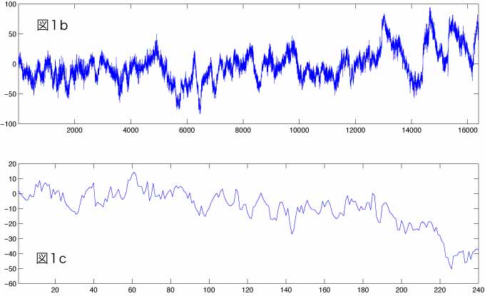 こういった周波数が一定の潮汐のような変動を除くと海洋のデータのスペクトル密度の分布にはある程度の幅の周波数域にわたって値の大きな部分があり、それより高い周波数(短い周期)域では周波数が増加(周期が減少)するにつれエネルギーが指数関数的に減少するような部分が見られるのが一般的です。こういった部分では値のおおきな部分で大気の変動などによりエネルギーが海洋に与えられ、この与えられたエネルギーが非線形作用と呼ばれる作用によって海洋内部で高周波数域に伝えられています。もっと高い周波数部分では粘性の作用により、運動エネルギーが熱に変換されて逸散されてしまいます。 図1bにこのデータの時系列プロットを、図1cにこのデータの最初の240個のみの時系列プロットを示します。このデータのサンプリング間隔は1時間ですので、図1cは10日分のデータになり、この中に1日周潮の潮汐は10回、半日周潮の潮汐は20回変動している筈なのですが、この図ではあまりよくわかりません。適当な数値フィルタを適用すれば潮汐成分の変動はかなり見やすくなりますが、パワースペクトル密度関数を計算すると、そのような手間をかけずに潮汐成分の存在がその周期や振幅といった情報や潮汐以外の周期の変動のもの迄含めて容易に把握することができます。