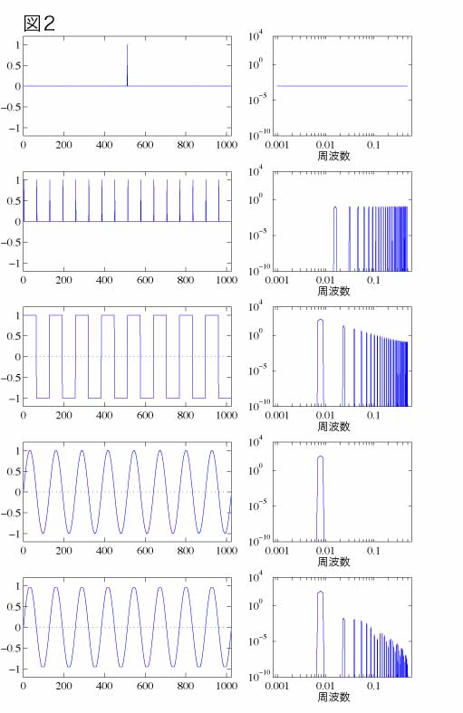 まず、1段目の最初にパルスがひとつ入っているデータですが、この場合のパワースペクトル密度は、周波数によらず一定となります。この例の場合、パルス以外は何もないデータなのですが、普通のデータに何らかの理由で比較的強いパルス状のノイズが1回入ったりすると、そのノイズのため、パワースペクトル密度が全周波数域で一様に大きくなり、ノイズ以外の部分が分かりにくくなる可能性があります。 次に2段目の周期的なパルスがある場合ですが、この場合パワースペクトル密度はこのパルスの発生周波数にピークが現れますが、それ以外にも一定の間隔でピークが現れます。例えばモータのようなものが一定周期でスパークを発生して、それがデータに混入するといった場合、このような状況が発生するかもしれません。 次に、3段目でデータの波形が矩形(四角)の場合ですが、この場合も矩形波の周期以外に一定の間隔でピークが現れます。論理回路では矩形波は珍しくないですが、実際にはこのような一定の幅の矩形波はクロックの出力以外は多分あまりないので、この例はあまり良い例ではないかもしれません。一般的なデジタルデータの伝送に必要な帯域幅を見積もるといった用途ではパワースペクトル密度が使われることもあるようです。 ここ迄記述した”問題点”は、パワースペクトル密度関数は時系列データを周波数の異なる正弦波(4段目が正弦波です)が足し合わされたものとして捉えることによります。矩形波の立ち上がり部分から平になる辺りの波形は急な角になっていますが、こういった部分を再現するためには非常に多くの周波数の正弦波を足し合わせる必要があります。このような理由で、パワースペクトル密度関数にはデータに含まれる信号の周波数(パルスの場合パルスの発生周波数。矩形波の場合矩形波としての発生周波数)以外にもピークが現れる事になります。 では、4段目のように入力データがきれいな正弦波の場合ではどうでしょうか?この場合はパワースペクトル密度関数は唯一つのピークを示すだけです。なお、右列の図ではピークは幅をもっていますが、これはパワースペクトル密度を計算する場合、その推定の精度を上げるためにスペクトルウィンドウをかけるといった操作(詳細は->ここ(FDSと表記)<-をクリックください)を行った結果によります。パワースペクトル密度関数の計算の場合、振幅の精度を上げるためには、周波数の精度を下げる必要があり、結果としてピークの幅が広くなります。 最後の例として、5段目で正弦波のピークを切ってみました。図では見づらいとは思いますが、4段目の正弦波は振幅は1.0としていますが、5段目ではこのデータの値が0.95以上は0.95に、-0.95以下は-0.95にすることにより、正弦波の頂きを平にしています。この場合はパワースペクトル密度関数に複数のピークがでてきます。正弦波をアンプに入力したところ、飽和してしまったような状況でしょうか。時系列プロットでは一見よくわからないようなことも、パワースペクトル密度関数を見ればすぐわかるという例になるかと思います。 最後に1つお断りしなければならない事があります。図2で示した結果は言わば最善の結果で、実際の計算ではスペクトル漏れ(詳細は->ここ<-をクリックください)と呼ばれる現象で入力データがまったく同じでもデータの長さ次第ではピークの巾が図2に比べ相当広がる場合があります。 なお、パワースペクトル密度関数の詳細については当事業所が提供する小額定型計算業務PD001A/Bのユーザガイドの第2章、第4章及び補足に記述していますので、必要があればそちらをご参照ください。 お取り扱いするデータの形式、計算内容、計算結果の内容及び形式やデータ授受方法といった業務全般を定型化することでコスト削減及び納期短縮を図った低価格のスペクトル密度計算サービスを開始致しました。詳細は->ここ<-をクリックください。 |