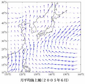 このページでご紹介している図は当事業所のデータ図表化のページで表示しているサンプル図の一部を拡大表示したものです。なお、図によっては、最新のデータを使用したものに差し替えています。 上図はNCEPの再解析海上風より計算した2005年6月の平均の海上風の分布です。データは日平均のものをNOAA-CIRES Climate Diagnostics Center, Boulder, Colorado, USAよりインターネットで入手致しております。元のデータの距離間隔は緯度経度とも2.5度で, 時間間隔は1日です。 なお、当事業所ではこの図で示した以外の海域についても、この図と同様の図を作成したり、その他のデータ解析作業を行うことも可能です。 |