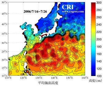 このページでご紹介している図は当事業所のデータ図表化のページで表示しているサンプル図の一部を拡大表示したものです。なお、図によっては、最新のデータを使用したものに差し替えています。 上左図はT/P、Jason-1、ERSやENVISAT等の人工衛星で観測されたデータ用いて緯度経度1/3度間隔で3日おきに全海洋データとしてAVISOが公表しているものを用い、2006年の7月16日より7月26日の期間で平均した海面高度です。黒潮は本州南岸沖の海面高度の傾斜が急な部分にありますが、上図では等高線が密になり過ぎ、文字通り黒い川のようになって見えます。 2001年9月から2006年6月迄の月平均の海面高度分布図を作成しましたので、ご興味のある方は御覧下さい。左の各年の文字付近をクリックすると別のウインドウが開き表示されます。 なお、当事業所ではこれらの図で示した以外の海域についても、これらの図と同様の図を作成したり、その他のデータ解析作業を行うことも可能です。 |