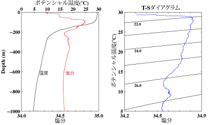 日本の海洋研究開発機構(旧海洋科学技術センター)がインターネットで公表している太平洋西部赤道でのCTDデータです。表面付近の温度と塩分の分布に注目しますと、温度は100m付近迄は比較的一様ですが、塩分については表面付近は低塩分になっていて、その下20〜50m付近まで比較的一様な層がありますが、その下では深さとともに大きく増大しています。このように太平洋西部赤道の表面付近は等温度層と等塩分層の厚さが一致しないことが多々あります。 |